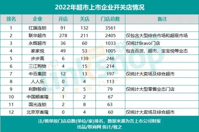据联商网零售研究中心统计,12家超市上市企业在2022年新开481家门店,却关闭了646家门店;截至2022年末,12家超市上市企业门店总数9043家。(注:多数企业均统计大卖场、综合超市等大型门店)