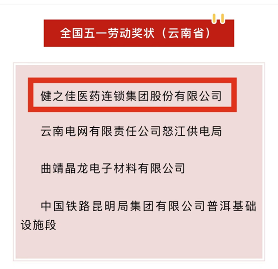 4月27日,中华全国总工会召开大会,表彰2023年全国五一劳动奖和全国工人先锋号获得者,全国五一劳动奖状207个、全国五一劳动奖章1035个、全国工人先锋号1044个。其中,健之佳医药连锁集团股份有限公司荣获“全国五一劳动奖状”。云南省仅有4家单位获此殊荣。