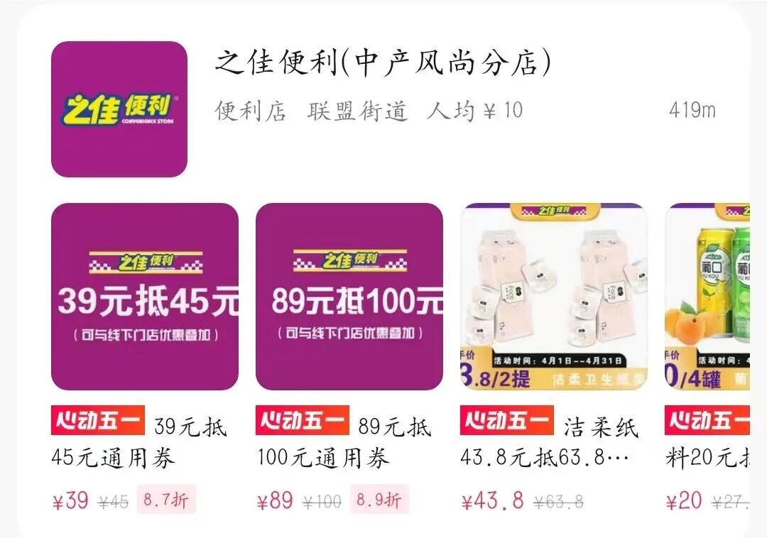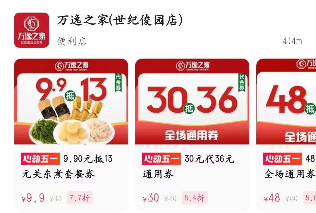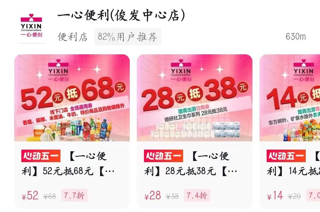 万逸之家、之佳便利、一心便利等便利店在抖音团购开启48抵60、52抵68、39抵45等不同金额团购券。