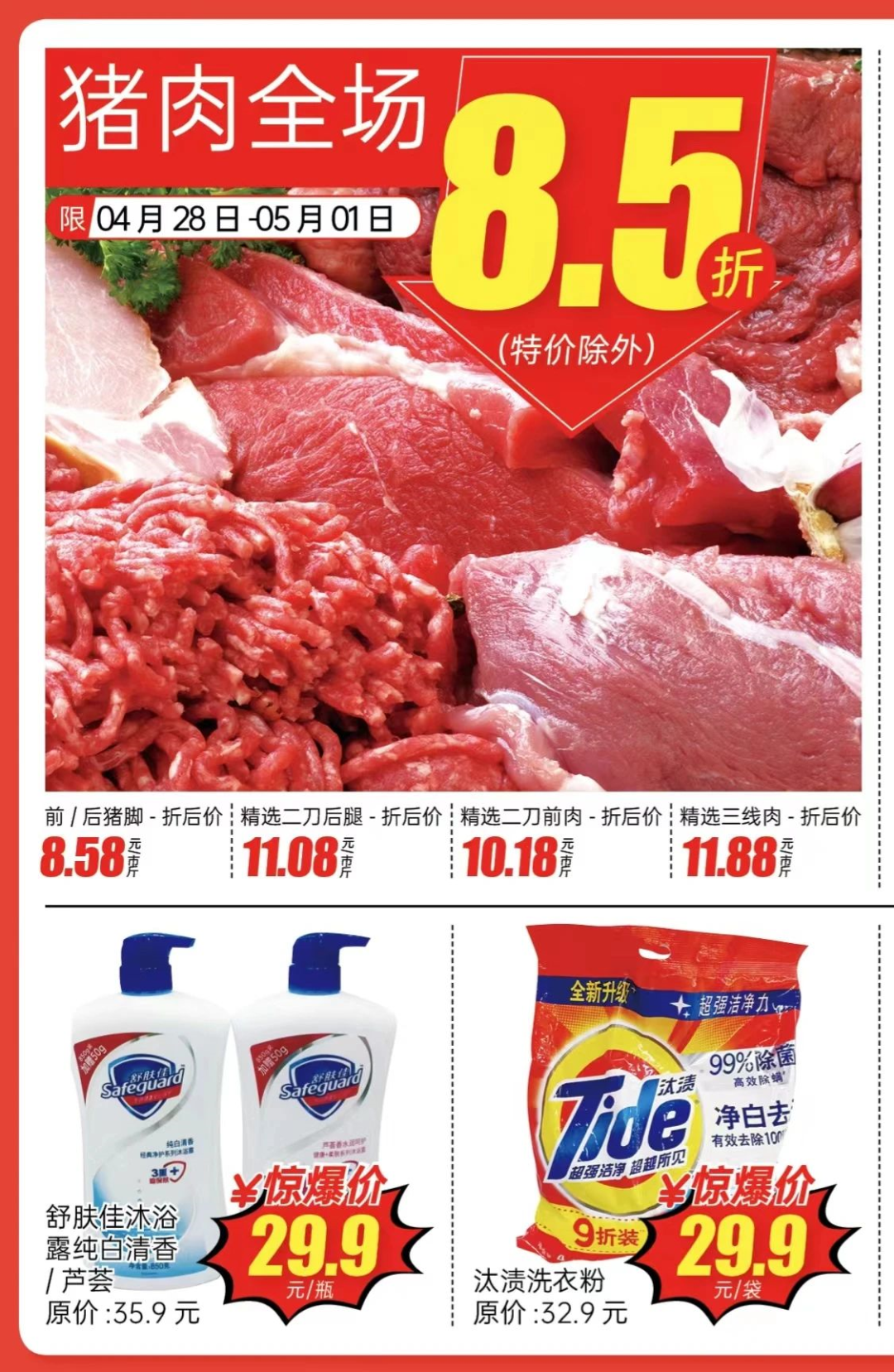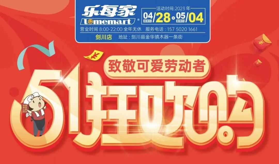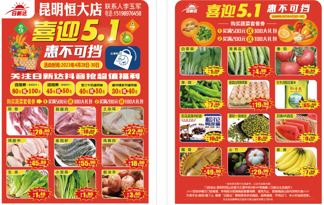 五一期间,日新达推出80抵100、45抵50等通用券;40抵50等雪兰牛奶通用券;30抵40康师傅系列通用券;蔬菜套餐券:买满500元送三百元大礼包,买满200元送100元大礼包活动。乐每家推出51狂欢购,猪肉全场8折(限4月28日—5月1日),生鲜、干货零食等惊爆价!诚意满满、优惠多多。