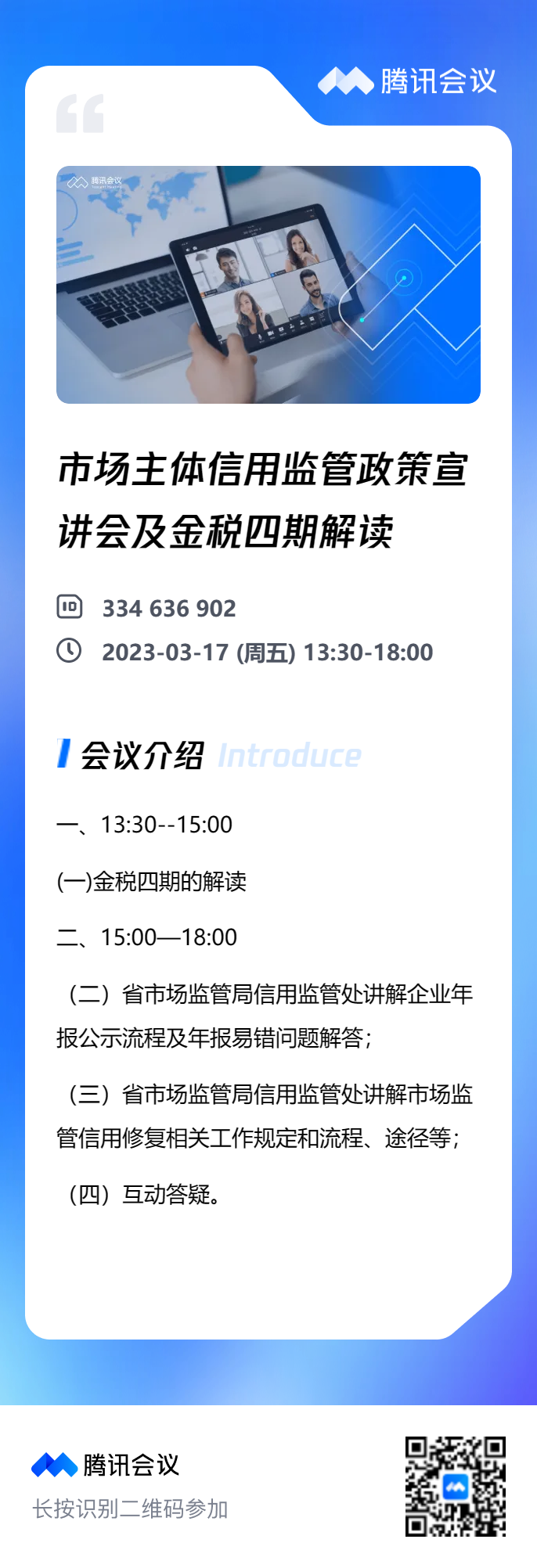 为持续优化营商环境,维护市场主体合法权益,激发市场主体活力,提高市场监管效能,推动企业高质量跨越式发展,2023年3月17日下午协会特邀云南省市场监管局开展市场主体信用监管政策宣讲,为企业答疑解惑,确保企业年报工作如期完成,力推企业蓬勃发展。同期,协会会员单位昆明卓锦商务信息咨询有限公司将为企业解读金税四期,助力企业全面了解“金税四期”,从容应对“智慧税务”。
