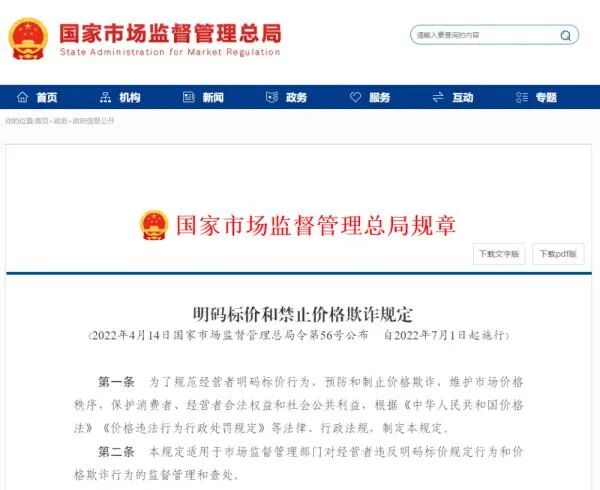 根据2022年4月14日国家市场监督管理总局第56号令《明码标价和禁止价格欺诈规定》于2022年7月1日正式实施。《明码标价和禁止