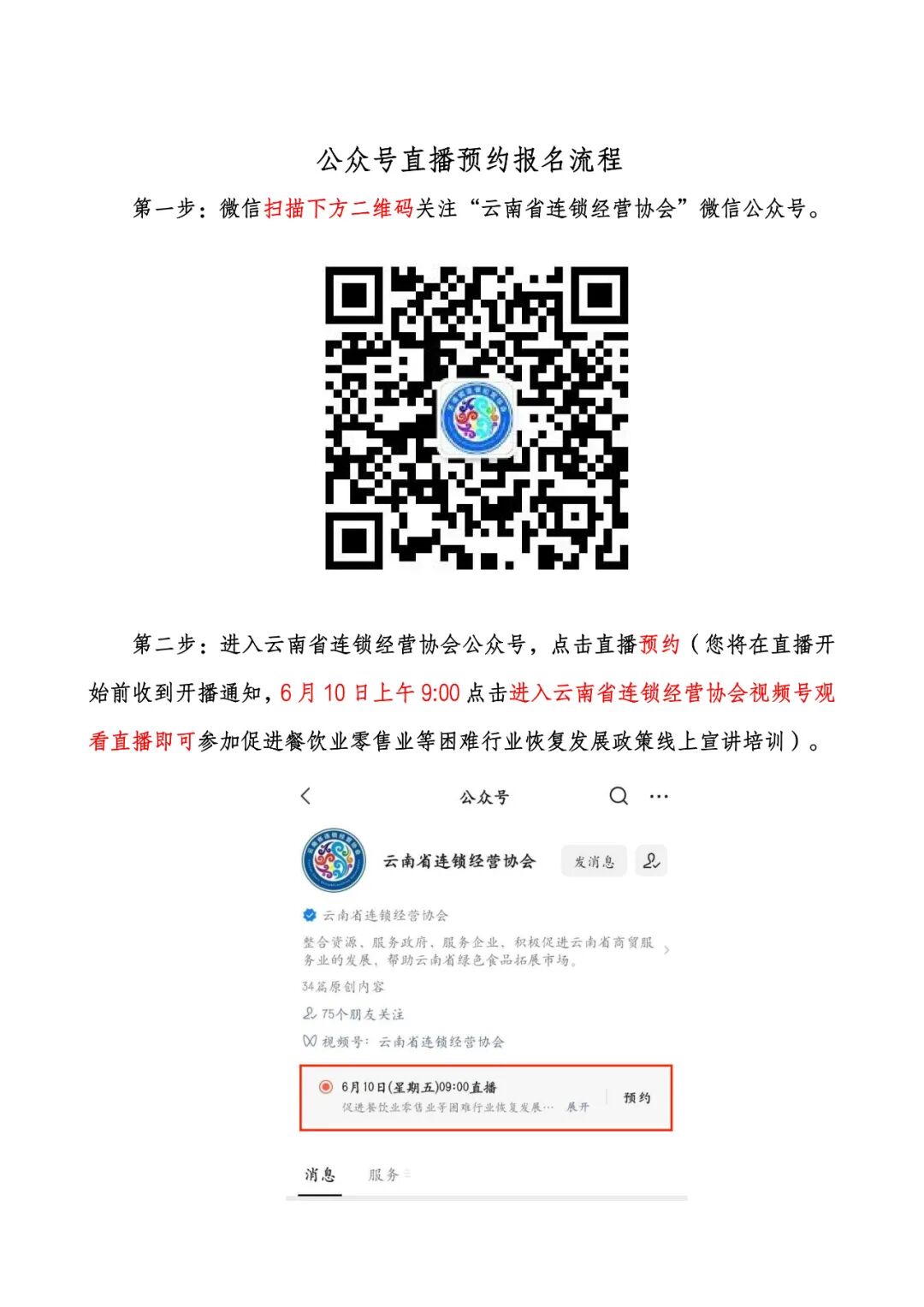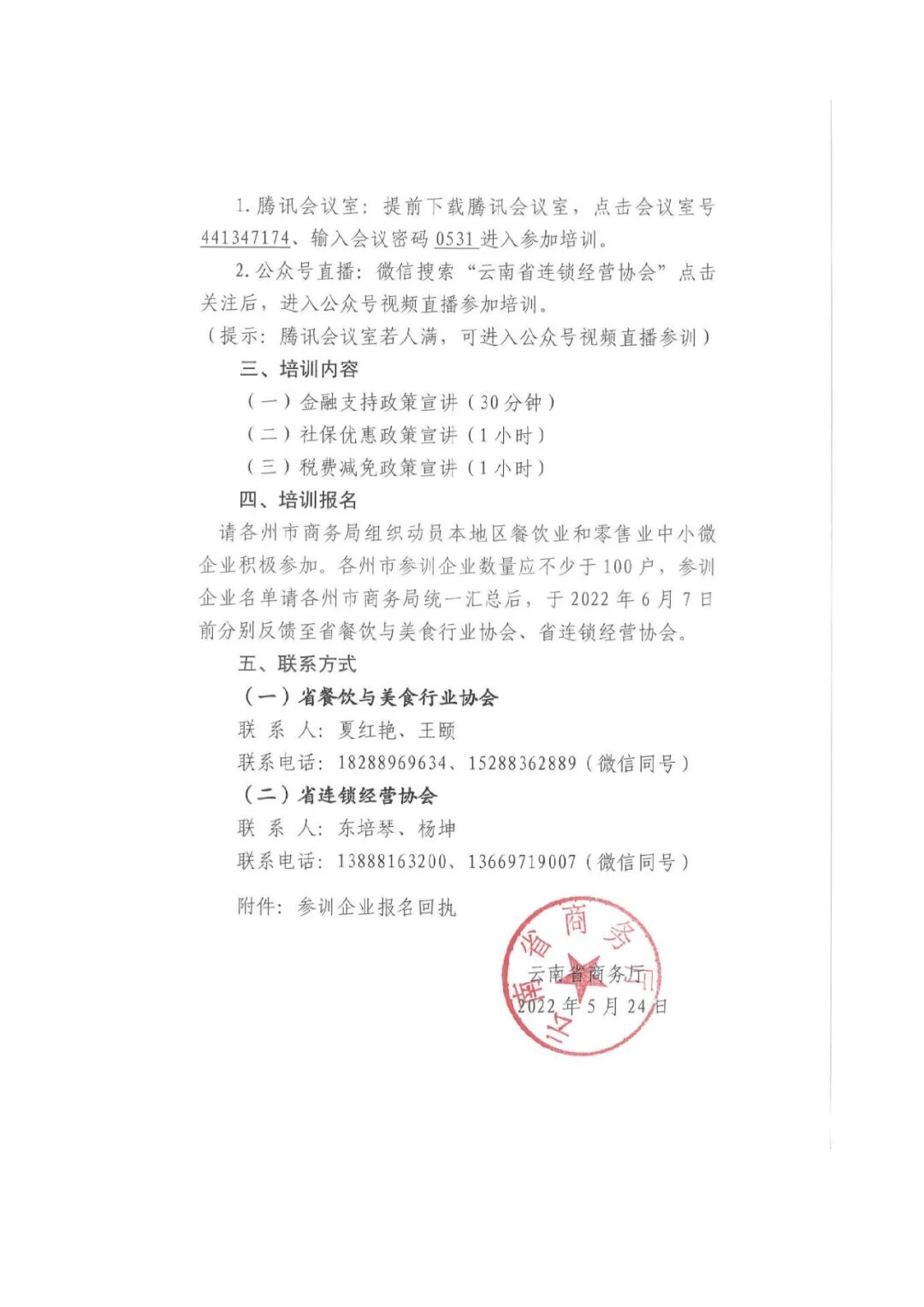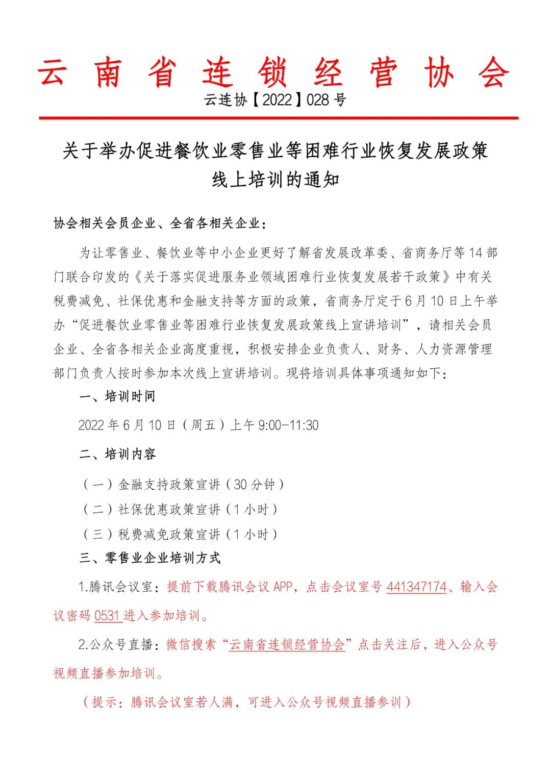 为让零售业、餐饮业等中小企业更好了解省发展改革委、省商务厅等14部门联合印发的《关于落实促进服务业领域困难行业恢复发展若干政策》中有关税费减免、社保优惠和金融支持等方面的政策,省商务厅定于6月10日上午举办“促进餐饮业零售业等困难行业恢复发展政策线上宣讲培训”,请相关会员企业、全省各相关企业高度重视,积极安排企业负责人、财务、人力资源管理部门负责人按时参加本次线上宣讲培训。现将培训具体事项通知如下:2022年6月10日(周五)上午9:00-11:301.腾讯会议室:提前下载腾讯会议APP,点击会议室号441347174、输入会议密码0531进入参加培训。2.公众号直播:微信搜索“云南省连锁经营协会”点击关注后,进入公众号视频直播参加培训。(提示:腾讯会议室若人满,可进入公众号视频直播参训)为做好培训服务工作,请填写附件2《参训企业报名回执》,于2022年6月7日17:00前通过微信或邮件发送到协会秘书处。附件:1.云南省商务厅关于举办促进餐饮业零售业等困难行业恢复发展政策线上培训的通知 2. 参训企业报名回执(请联系秘书处工作人员获取) 3. 培训预约报名操作流程