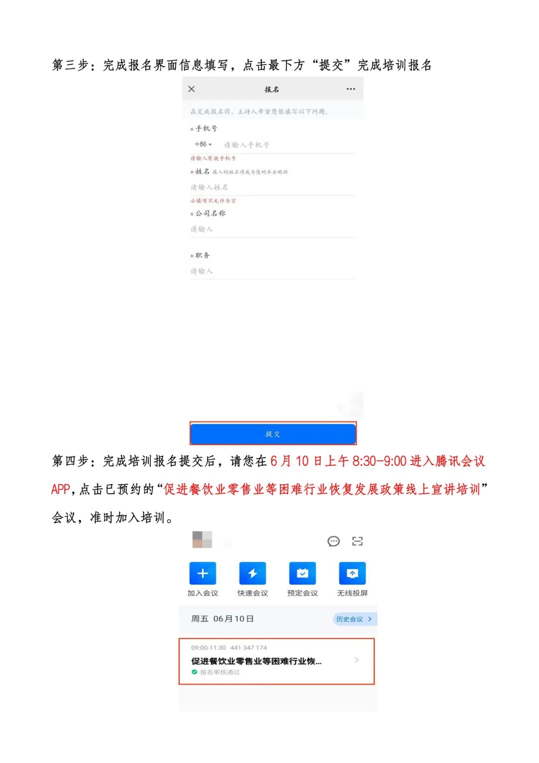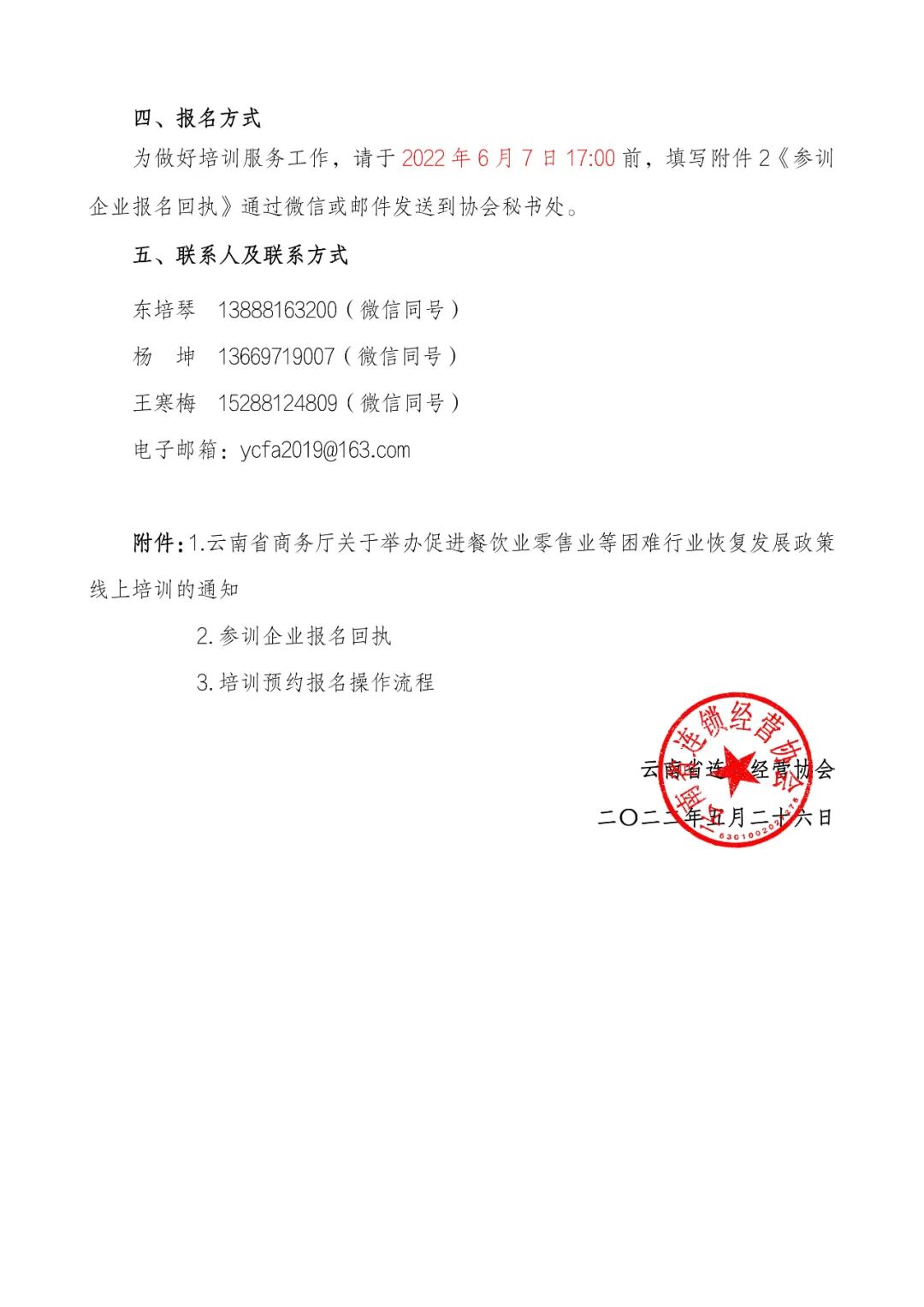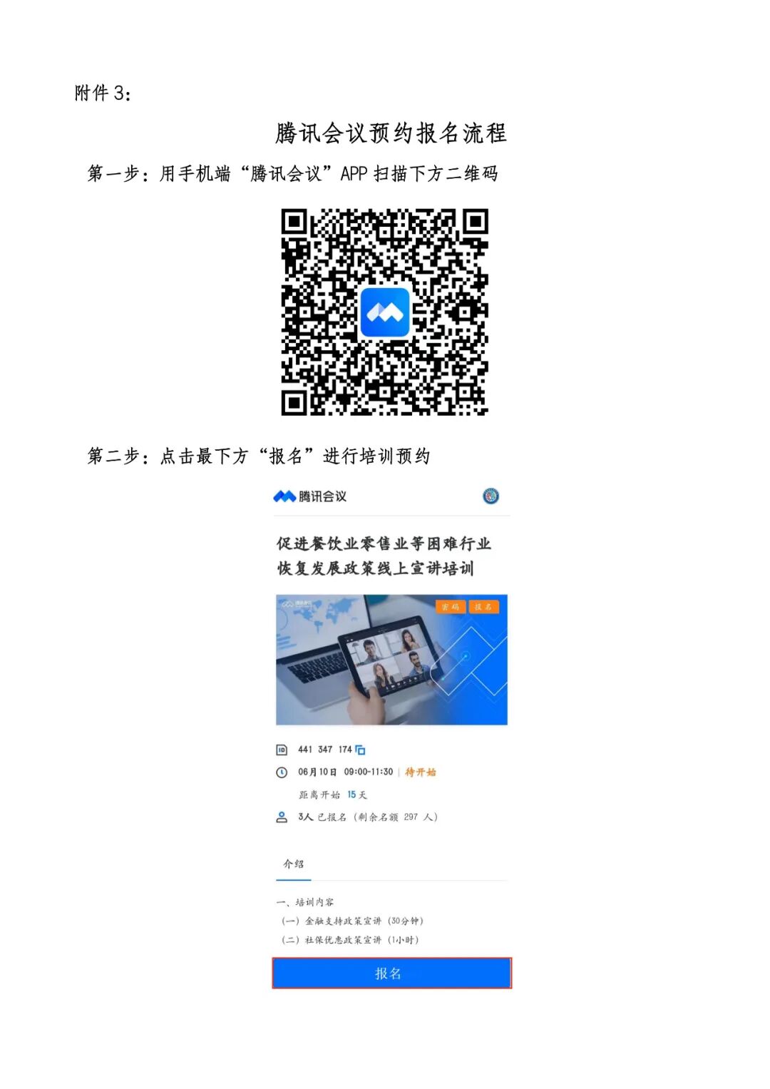 为让零售业、餐饮业等中小企业更好了解省发展改革委、省商务厅等14部门联合印发的《关于落实促进服务业领域困难行业恢复发展若干政策》中有关税费减免、社保优惠和金融支持等方面的政策,省商务厅定于6月10日上午举办“促进餐饮业零售业等困难行业恢复发展政策线上宣讲培训”,请相关会员企业、全省各相关企业高度重视,积极安排企业负责人、财务、人力资源管理部门负责人按时参加本次线上宣讲培训。现将培训具体事项通知如下:2022年6月10日(周五)上午9:00-11:301.腾讯会议室:提前下载腾讯会议APP,点击会议室号441347174、输入会议密码0531进入参加培训。2.公众号直播:微信搜索“云南省连锁经营协会”点击关注后,进入公众号视频直播参加培训。(提示:腾讯会议室若人满,可进入公众号视频直播参训)为做好培训服务工作,请填写附件2《参训企业报名回执》,于2022年6月7日17:00前通过微信或邮件发送到协会秘书处。附件:1.云南省商务厅关于举办促进餐饮业零售业等困难行业恢复发展政策线上培训的通知 2. 参训企业报名回执(请联系秘书处工作人员获取) 3. 培训预约报名操作流程