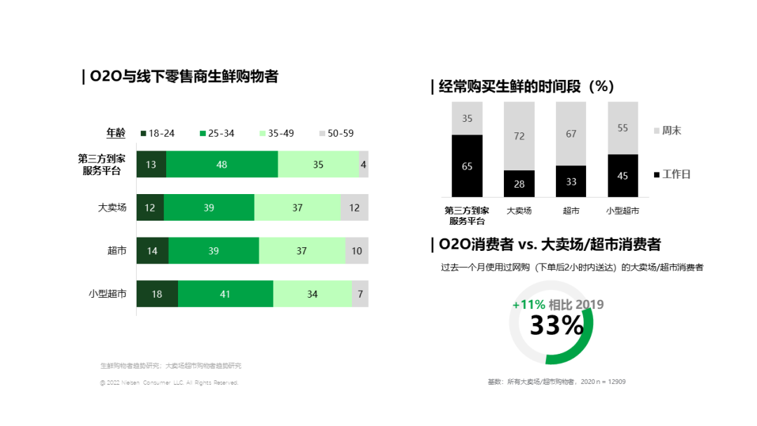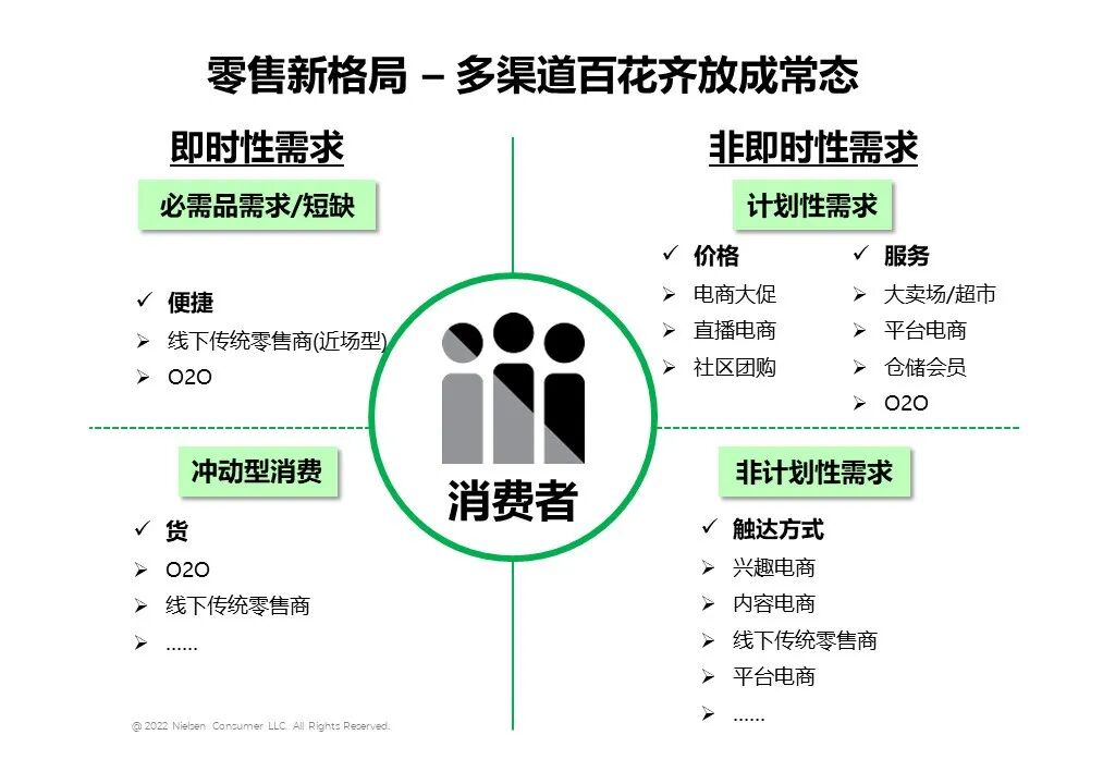 尼尔森IQ中国区董事总经理宋烨表示,未来,中国零售渠道将继续探寻新的发展模式。一是传统商超、大卖场等渠道的转型与变革,发展基于线上线下全渠道融合,解决消费者便利,贴近社区需求的小型社区店、专业店、便利店等小而美的“小业态”店,是未来实体商超业态转型的热门方向。二是O2O全渠道转型升级逐渐成为行业共识。随着用户习惯的养成及新零售模式的创新,未来增长潜力巨大。 尼尔森IQ研究发现,2021年零售整体全渠道负重前行,线上与线下的增幅分别为5%、3%。线上传统平台电商自有流量见顶,借力传统节庆来复制造节模式进行销售刺激,但效果未达预期。而内容电商的用户端规模日趋成型,自建流量闭环时机已到;市场端面临重新洗牌局面,“去中心化”给予行业准入和内容质量更多发展可能性。存量争夺战号角吹响,新一轮的线上竞争已然拉开序幕。线下零售小型化、近场化依然主导门店扩张趋势,进一步分化大业态销售。归根到底是便利店、食杂店这样的小业态能更好地满足消费者的即时性消费需求。此外,由疫情即时性消费需求增强而催生的社区团购风靡一时,而后行业内部历经整合,磨沙砾金,格局逐渐稳固。追随而至的是拥有更成熟模式和体系的“后浪”们,这其中极具代表性的是O2O以及会员仓储店。O2O模式与线下零售相爱相杀,无论在门店场景、客群划分还是品类策略上面皆为既分化又互补,因此,差异化的品类和选品策略是二者协同发展的关键。会员仓储店则是在线下零售争相试水的热捧之下,迎来飞速发展,然而风起观潮,了解本地消费习惯并建立成熟的供应链才是仓储模式在中国长足发展的重要前提。