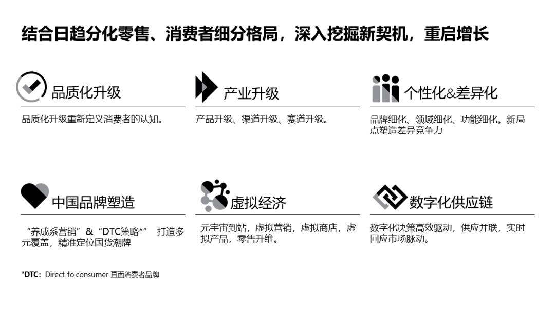 后疫情时代人均消费支出回升,但物价上涨压力渐增,根据尼尔森IQ调研结果显示,53%的中国消费者感受到物价上涨的压力。因此,中国消费者在保证品质的前提下会明智地寻求高性价比产品来降低日常消费支出,这其中包括线上比价,购买品牌认可度高的大包装产品,以及权衡最重要属性(需求),理性购买。 另一方面,由重点消费人群所带来的消费机遇值得关注。刚刚落地的三孩生育政策将为婴童市场未来的发展带来潜在的扩张红利。青年经济消费博弈论凸显。Z世代一边愿意为新奇特的产品付更高的价格,一边又非常理性,寻找最高性价比的时机才出手。现实生活的“社恐”催生了一人食,一宠陪经济,而热衷虚拟社交则打开数字营销的新大门。银发一族有钱有闲,悦己需求驱动抗衰老产品消费升级。为银发一族量身打造的产品以及配套服务市场仍有空白,一系列周边产业有望兴起。零售格局的多渠道业态并存与后疫情时代的潜力消费人群细分及需求相互交织,构成孵化未来商业新契机的立体矩阵。从最近的一年中,可以清晰地感知到带有中国印记的品牌正摘掉代加工的帽子,迅速崛起于行业的各个细分赛道。与此同时,供应链和运营策略的数字化正在帮助中国品牌实现差异化切入,构建从品牌塑造到品质升级的竞争优势。 2021年被称作“元宇宙元年”,这个超越现实的虚拟世界带来了虚拟经济的新契机。得益于互联网使用的普及与潜力消费人群的虚拟社交需求,元宇宙的原住民规模会远比想象中庞大,越来越多的网民乐于参与虚拟世界社交,进行代币购物的新体验。这使得错过了电商发展机会的零售巨头们争相入局虚拟经济,以期取得起跑线先发优势,利用包括数字人在内的虚拟模式打造虚拟营销,建立虚拟店铺、虚拟零售是零售升维的新契机。 尼尔森IQ中国区高级副总裁周凌卿说,元宇宙是新概念,但它的内涵并不新,它就是我们常说的虚拟世界。随着新一代通讯、虚拟现实、区块链、大数据、云计算、物联网、人工智能等领域的新技术不断迭代进步,打造一个“身临其境”的虚拟世界成为可能。在这个构建元宇宙的过程中,势必不断裂变出比互联网时代更为密集的、更为猛烈的新的经济增长点。 尼尔森IQ研究发现,以满足日益深化的消费者需求为前提,渠道升级,品牌升级,体验升级将成为刺激中国零售重启增长的新动力。国家长期以来对于扩大消费和支持电子商务产业发展的政策措施,正加速推动消费转型升级、催生新兴业态,成为经济发展新的原动力。