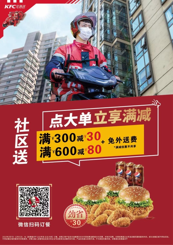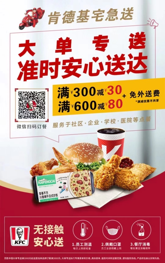 前不久,“七万份肯德基餐点为风控区的居民带来惊喜”冲上热搜榜。3月1日,广东省深圳市福田区政府为上沙村、下沙村以及新洲社区封管控区居民的餐食犯愁,紧急联系了百胜,公司发动全市近300家肯德基门店开足马力,在4小时内就圆满完成了交付任务。看到封管控区居民收到了七万份肯德基的套餐,通过社交平台分享喜悦之情,公司上下无不感到欣慰。第二天,一箱箱印有“抗疫必胜、深圳加油”字样的必胜客午餐又送进了上沙封管控区。基于现阶段疫情防控遇到的难题,百胜中国经过紧急有序筹备,于3月15日在全国各市场推出 “大单准时安心送”服务,保证团体消费者下单便捷,安心取送,品类丰富,有正餐、下午茶、夜宵,还有可以囤在冰箱里加热即食的新零售产品,为一线人员和居民们提供多样、安全、准时的餐饮选择。旨在特殊时期,为社区、企业、学校、医院等所在人群,提供大单专送服务,满足特殊时期的餐饮保障需求。![]()