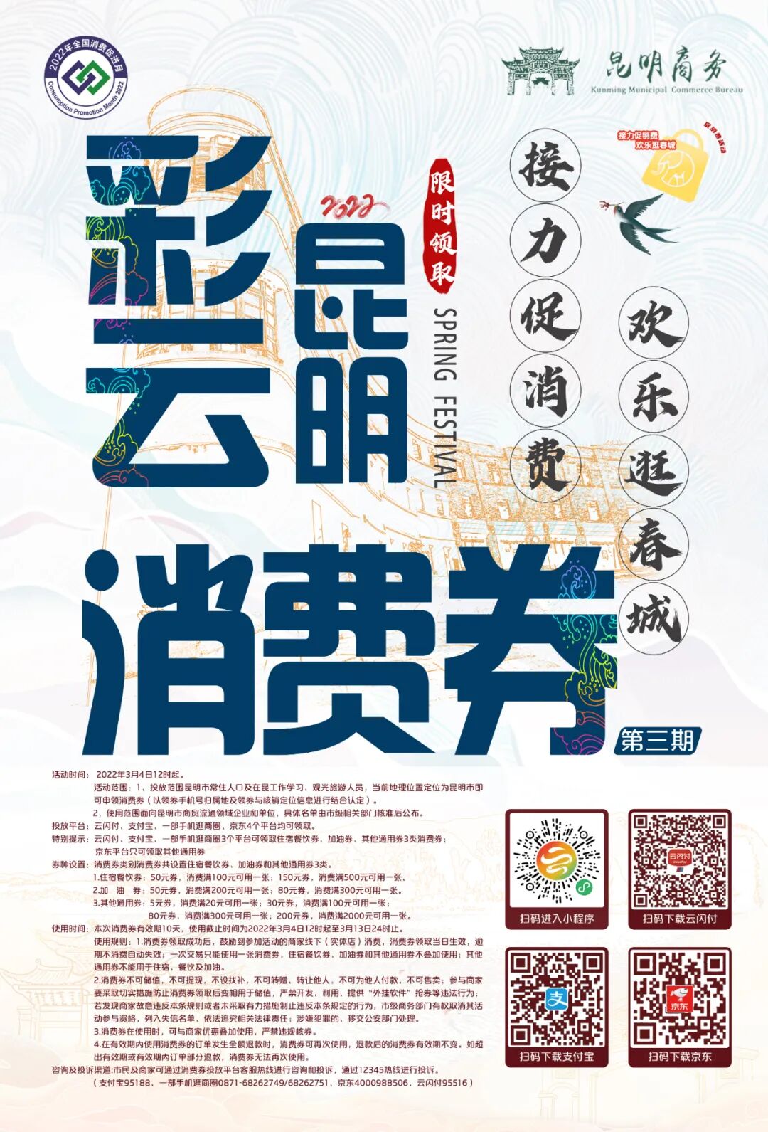 为深入落实中央和云南省、昆明市关于坚定实施扩大内需战略、全面促进消费的决策部署,进一步提振消费信心,有效激发居民消费潜力,增强消费对经济发展的基础性作用,经研究,决定开展总金额5000万元的“彩云昆明消费券”发放活动。第三期将于2022年3月4日发放,特将相关事项通告如下: