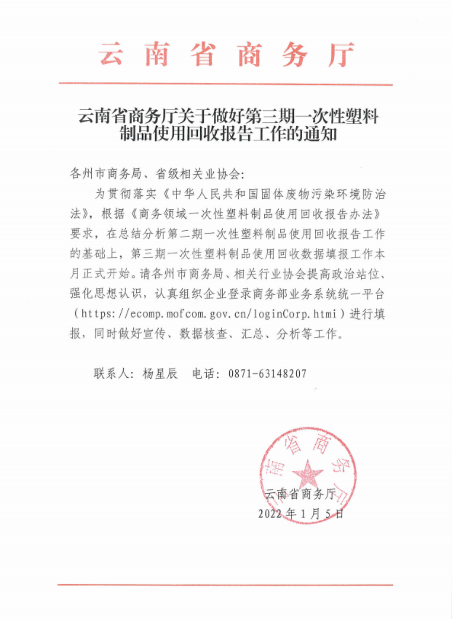 协会各会员企业、全省各相关企业:第三期一次性塑料制品使用回收报告工作已于日前正式开始,请各相关企业按照《云南省商务厅关于做好第三期