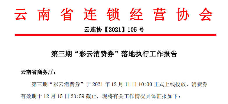 六是组织行业促销,积极促进消费增长。在省商务厅和中国人民银行昆明中心支行指导下,围绕“云集好物 畅购五月”2021 年云南省消费促进月活动,联合中国银联云南分公司,以大型惠民活动为核心,累计发放暖心惠民消费券 50万张。在省商务厅统筹指导下,围绕“喜迎中秋 欢度国庆 点亮云南夜 畅购云品荟”活动主题,动员组织会员企业及全省商贸流通领域优质商户共同发起“云集好物·畅购双节”系列促消费活动,活动包括但不限于满减、特价、折扣、买赠、刮奖、积分兑换购物券等,参与企业覆盖16个州市。积极承接省商务厅“云南省零售业促销费咨询统计服务”项目,助推“彩云消费券”发放活动组织有序、顺利开展、取得成效。主要工作包括:及时制定《云南省连锁经营协会“彩云消费券”落地执行工作方案》,并报送至省商务厅备案。及时组织专题研究,并向省商务厅提交《关于<“彩云消费券”发放活动实施方案>的修改建议》。及时发布《关于组织参加云南省商务厅消费劵发放活动的通知》,并一对一沟通,积极动员会员企业及全省相关企业报名参加“彩云消费券”发放活动,确保符合条件的会员企业全部参与活动,参与企业门店覆盖全省129个县(市、区)。及时反馈企业报名中存在的问题和困难,建议紧急召开现场技术对接会议,8家会员企业参加会议。结合技术对接需求,及时建立3个微信群,将报名参加活动会员企业全部邀请入群,同时主动与州市商务部门联系沟通,邀请当地企业进入技术对接微信群,使报名中存在的问题得到及时反馈和解决。加强与平台方联系沟通,督促平台方逐步完善技术流程和操作指南,及时分析解决报名中存在的问题。积极对接指导参加活动会员企业完善报名资料,完成数据匹配,开展核券测试,做好门店培训,并将存在的问题反馈至平台方。积极发动会员企业及全省相关企业,在“彩云消费券”基础上,结合司庆、店庆、会员日、双12、年终大促等消费特点,创造性地开展“折上折”系列促消费活动,最大程度地惠及消费者,吸引消费者到店消费。在协会微信公众号开设“彩云消费券”专栏,持续做好宣传报道,提醒消费者及时领券、用券,引导参与企业全面做好营销宣传工作。充分发挥参与企业与平台方、省商务厅的桥梁纽带作用,及时收集企业反馈的问题,汇总至平台方、省商务厅,第一时间跟进解决消费券领取、核销中存在的问题。组织召开“彩云消费券”营销宣传动员腾讯视频会议,充分调动参与企业营销宣传积极性,引导企业加强活动风险防控,在合规经营中做好消费券营销宣传工作,50余家企业近200人参加会议。积极协调对接,配合主流媒体做好典型企业宣传报道。组织前往重点企业门店进行抽查,及时分析问题和不足,督促参与企业加大宣传、培训力度,抽查范围涉及全省16个州市、近400家门店。每周向省商务厅提交工作报告,并对有关工作提出意见和建议。