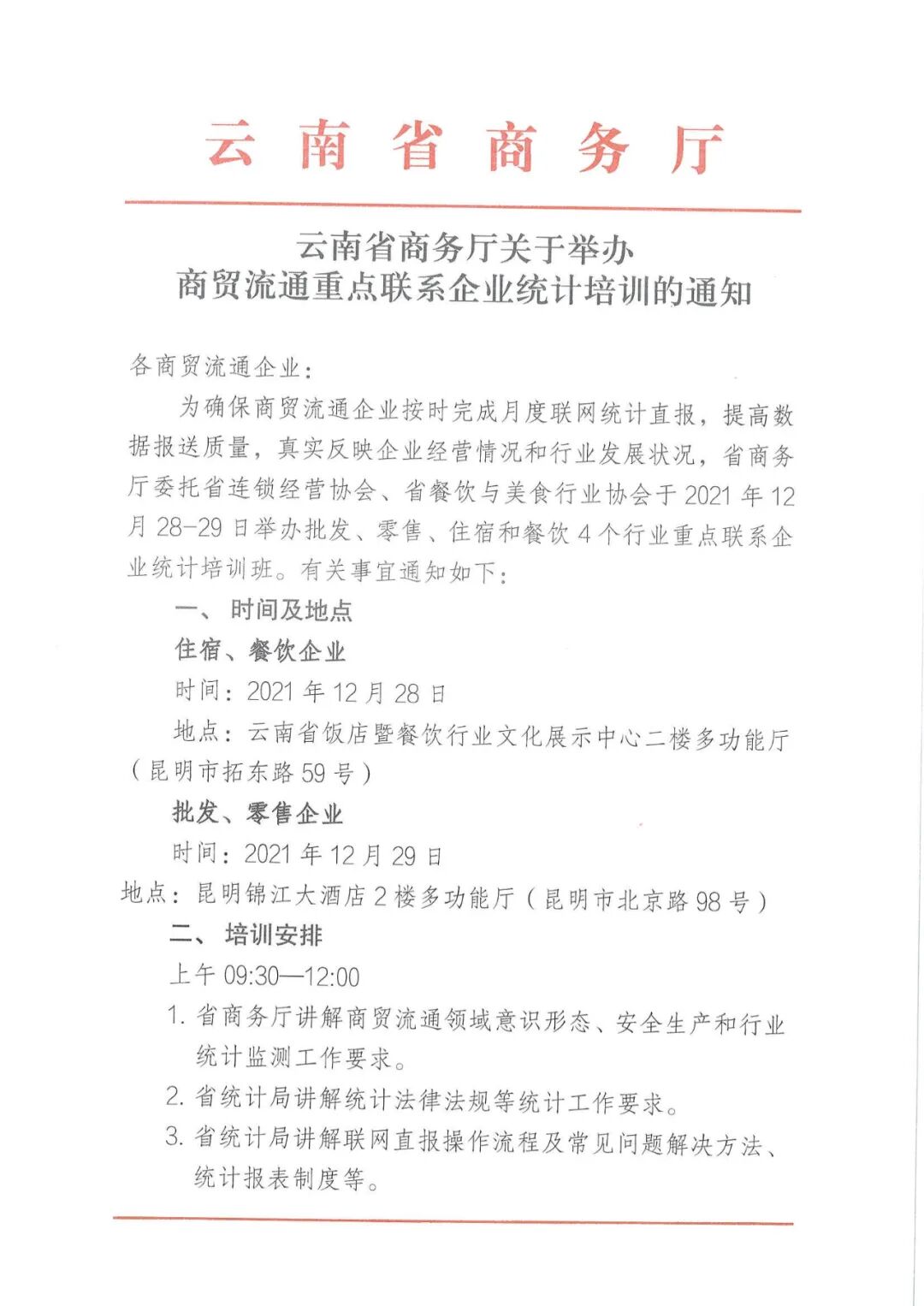 协会各相关会员企业:现将《云南省商务厅关于举办商贸流通重点联系企业统计培训的通知》转发给你们,请各相关会员企业高度重视,积极报名参