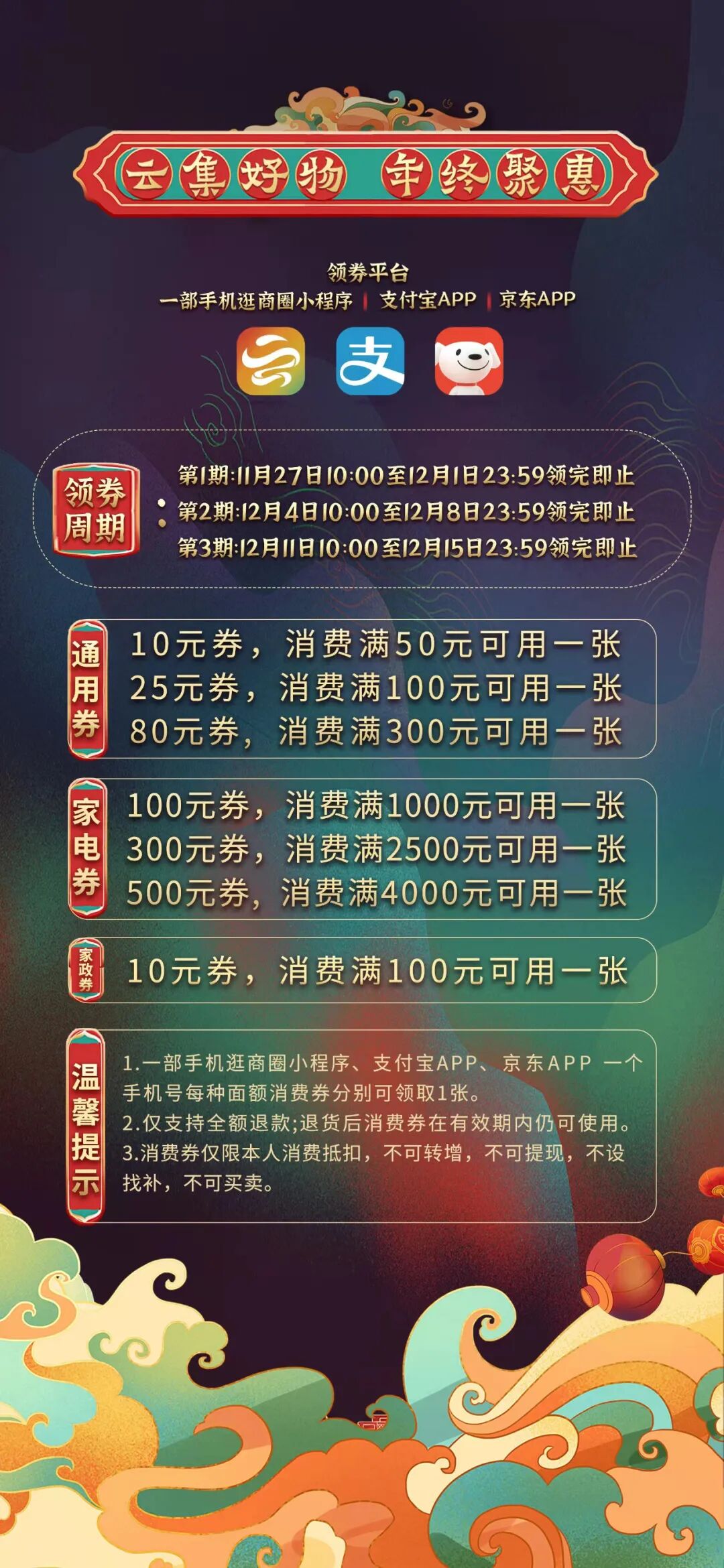 第二期“彩云消费券”发放时间为2021年12月4日上午10时,抢完即止。消费券使用截止时间为从消费券发放当日(含当日)开始计算的第5日24:00前,第二期消费券有效期于2021年12月8日23:59:59截止。全省范围内发放(以领券手机号归属地及领券与核销定位信息进行结合认定)。 “彩云消费券”分为通用券和专用券两种,每批次消费券发放时,消费者可通过“一部手机逛商圈”微信小程序、支付宝APP、京东APP三个平台领取,每种面额的消费券每个手机每期在各平台最多可领取一张。消费券领取当日生效,逾期不消费自动失效;一次交易只能使用一张消费券,除企业加油券外,通用券和专用券不得叠加使用。第二期消费券类型及面额如下:(1)家电券:100元券,消费满1000元可用一张;300元券,消费满2500元可用一张;500元券,消费满4000元可用一张。(2)家政券,面额10元,消费满100元可用一张。(3)企业加油券,由成品油流通企业自行设置,通过支付宝APP领取,可与通用券叠加使用。参与活动企业名单以省商务厅官网公布为准(第二期参加企业名单请点击本文左下角“阅读原文”进入查询)。消费者可拨打支付宝(95188)、京东(4000988506)、建设银行(0871-68262749、68262751、95533)客服中心电话以及商务投诉举报中心(工作日0871-63185263)咨询和投诉。(一)参加各类消费券使用的企业(单位)要切实维护消费者权益,确保消费券按照相关使用规则使用,且在商家自主让利折扣活动的基础上正常使用,最大限度让利于消费者。(二)消费券不得提现,不设找补,不可用于充值,不能拆单使用;严禁企业通过虚假交易进行消费券套现等违法行为;严禁通过社交软件、网络平台等信息渠道,发布、传播套现消费券等违法信息;严禁开发、利用、提供“外挂软件”抢券等违法行为,对有以上行为的单位和个人,取消彩云消费券活动参与资格,列入失信名单,依法追究相关法律责任;涉嫌犯罪的,移交公安部门处理。 文章来源:黑龙江省连锁经营协会