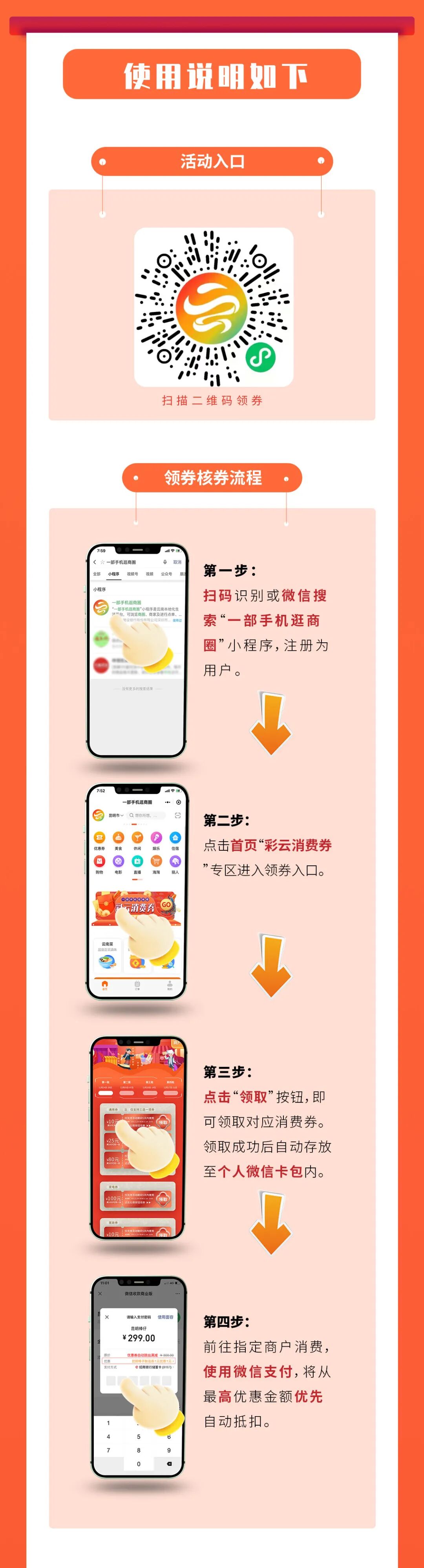 “彩云消费券”分为通用券和专用券两种,每批次消费券发放时,消费者可通过“一部手机逛商圈”微信小程序、支付宝APP、京东APP三个平台领取,每种面额的消费券每个手机每期在各平台最多可领取一张。