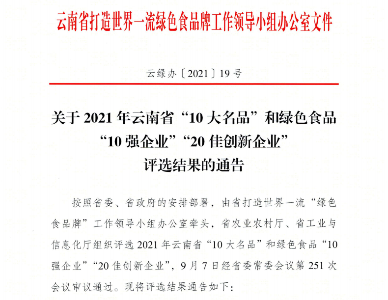 9月23日,云南省打造世界一流绿色食品牌工作领导小组办公室印发了《关于2021年云南省“10大名品”和绿色食品“10强企业”“20佳创新企业”评选结果的通告》,云南省连锁经营协会5家会员单位榜上有名。