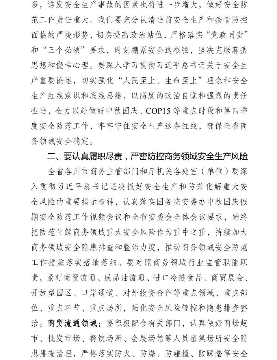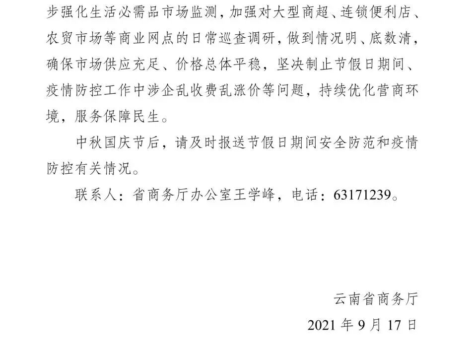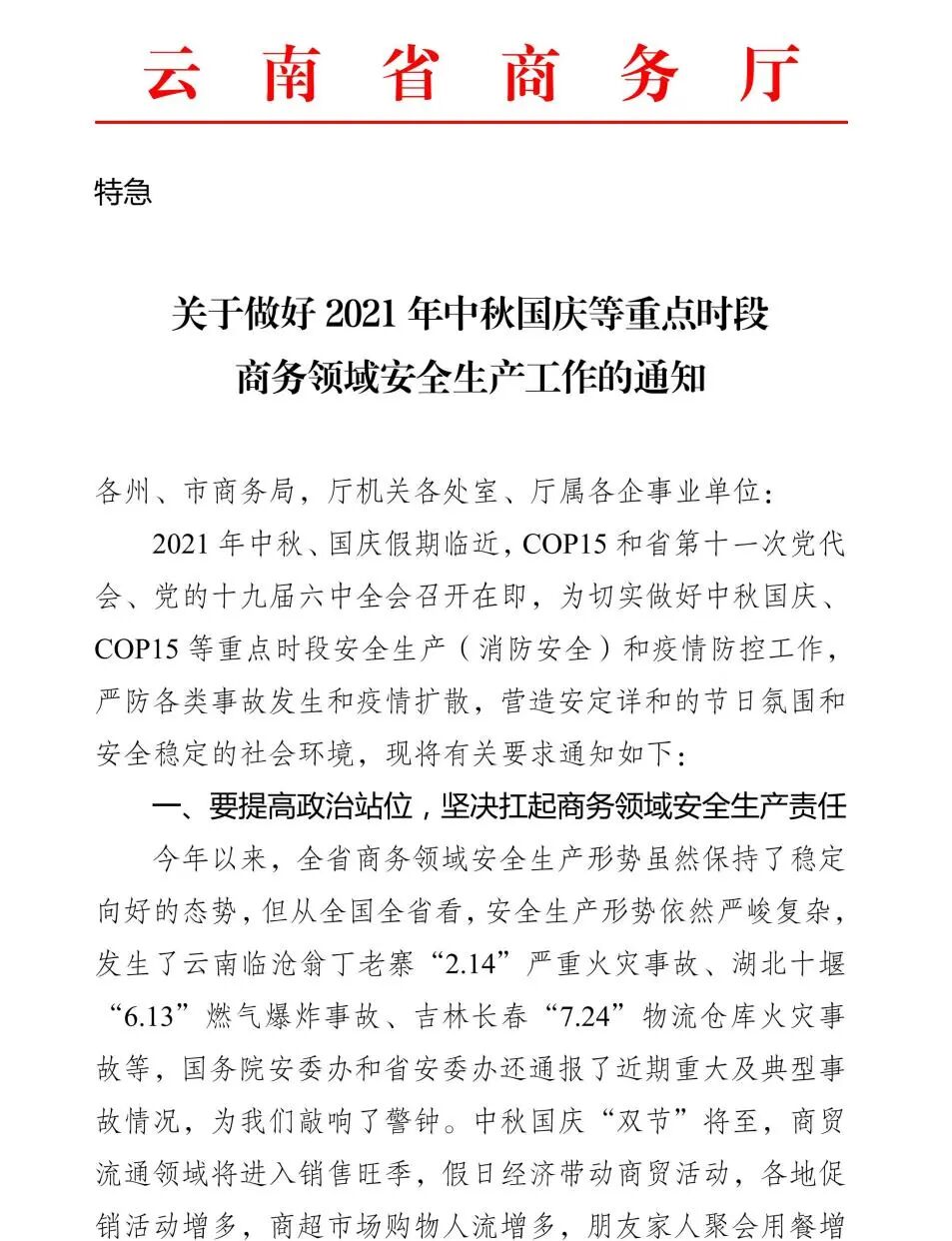 云南省商务厅关于做好2021年国庆等重点时段商务领域安全生产工作的通知