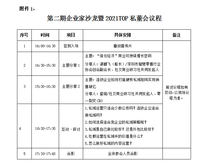 为深入学习党的十九届五中全会精神,积极融入新发展阶段、贯彻新发展理念、构建新发展格局,帮助云南省广大商贸流通企业创新经营思路,提升经营能力,有效带动社会消费品零售总额的增长,促进云南省商贸流通行业的健康发展,云南省连锁经营协会定于2021年9月25日(星期六)下午在昆明举办第二期企业家沙龙暨社交研习社2021TOP私董会活动。本次活动邀请到深圳市智慧零售行业协会创会副会长、社交商业研习社共同发起人谌鹏飞(船长),社交商业研习社共同发起人、零一裂变CEO鉴锋担任嘉宾,现场分享《“信任经济”可持续增长密码》《连锁企业如何打造硬核私域矩阵实现销售破亿》,并充分展开互动和探讨,帮助广大商贸流通企业以自身“确定性”有效应对外部“不确定性”,从而守正出新、拥抱变化,更好地应对经营管理中面临的挑战和机遇。有关事项通知如下:2021年9月25日(星期六)下午14:00-18:00昆明市盘龙区联盟路与万宏路交汇处万宏嘉园健之佳总部大楼根据常态化疫情防控要求,本次活动限20家会员企业参加(每家限2人,对象为企业主要负责人),名额有限,先报先得。1.为做好会务服务工作,请各会员企业及时填写参会回执表(见附件),并于9月24日15:00前,通过微信或邮箱反馈至协会秘书处。2.请各参会人员严格按照疫情防控要求做好个人防护,近期有中、高风险地区旅居史的人员不得参会。附件:1.活动议程