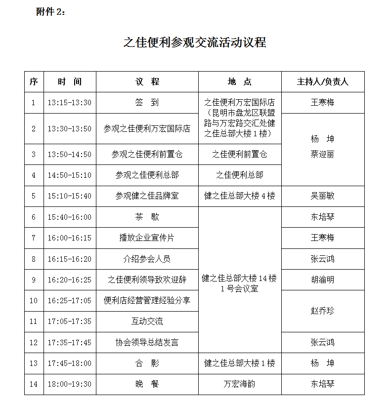 为增进委员单位(会员企业)之间的相互了解,学习品牌连锁便利店企业先进的经营管理经验,促进云南省便利店业态的健康发展,云南省连锁经营协会便利店委员会定于9月16日下午组织委员单位及协会有关会员单位前往副会长单位云南之佳便利店有限公司参观交流,有关事宜具体通知如下:9月16日下午13:30—18:00(13:15—13:30签到)云南之佳便利店有限公司(昆明市盘龙区联盟路与万宏路交汇处)3.邀请便利店企业食品供应商参加(限会员单位,限1人)。为做好活动筹备及有关服务工作,请认真填写报名信息回执表(附件1),并于9月13日12:00前通过微信或邮件发送至协会秘书处。协会秘书处联系邮箱:ycfa2019@163.com附件:1.便利店委员会活动报名信息回执表(通过本公众号首页回复“之佳便利”获取) 文章来源:黑龙江省连锁经营协会