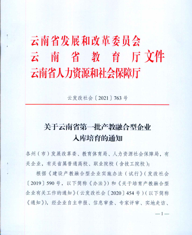 近日,云南省发改委、云南省教育厅、云南省人力资源和社会保障厅联合发文,公布“云南省第一批培育产教融合型企业入库名单”,云南省连锁经