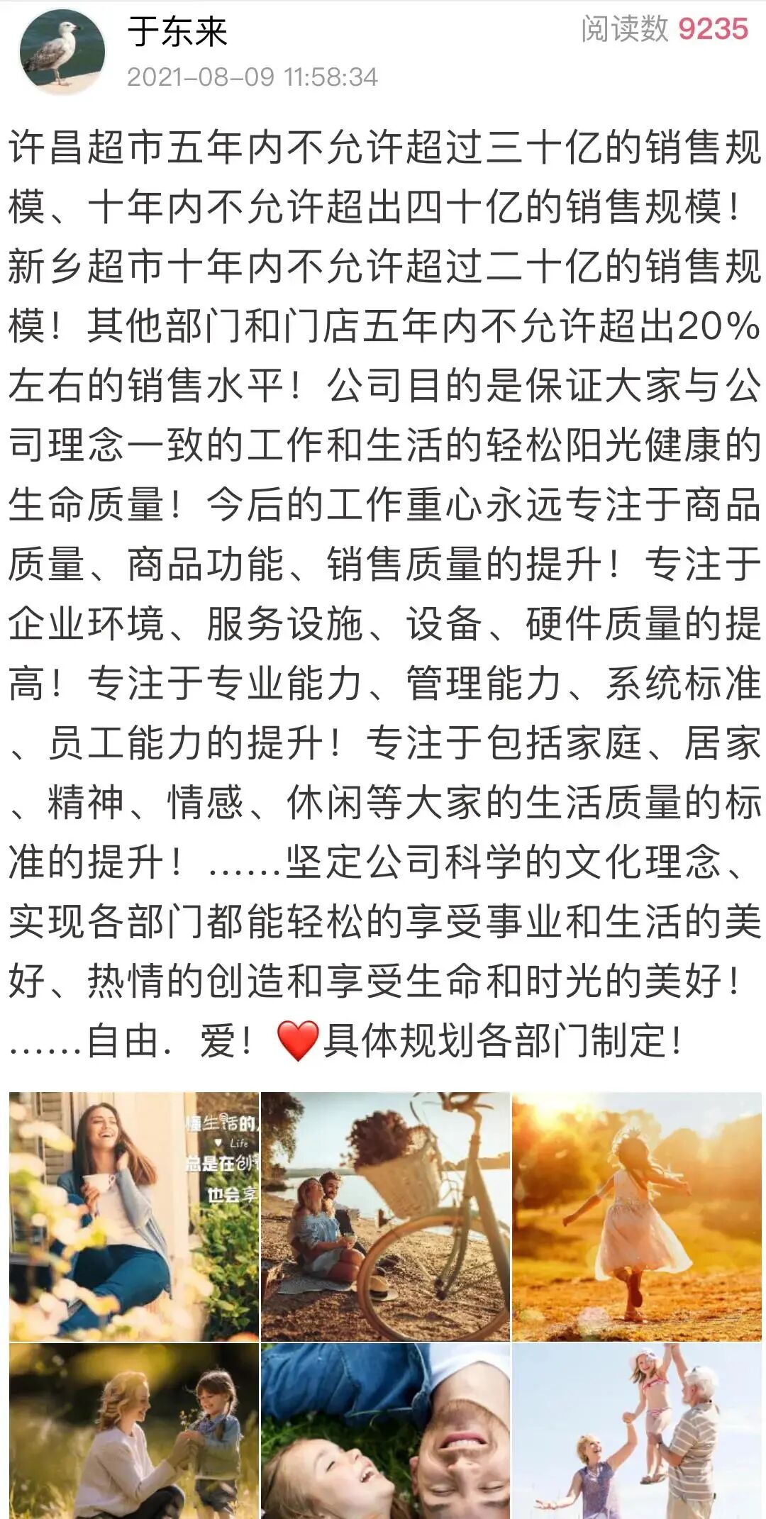 8月9日中午,河南胖东来商贸集团董事长于东来在《东来随笔》中写道:“许昌超市五年内不允许超过三十亿的销售规模、十年内不允许超出四十