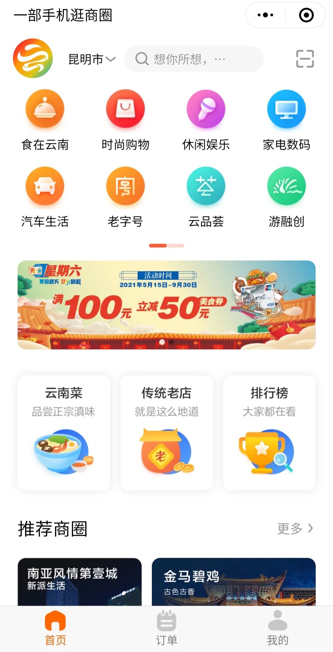 平台应用覆盖了省内餐饮、旅游、商超、特色集市等消费场景,可实现商业数据分析、商圈生态管理、线上消费等服务,为商家和客户带来便利化、数字化、智能化消费新体验。平台可为企业提供五个方面的特色化服务:一是所有商户免费入驻平台,无订单抽成。二是平台可高效整合政府侧与建行各类优质资源,以线上线下相融合的模式投入平台运营,减轻企业经营负担。三是平台可为商户实现ERP数据统计功能,助力企业实现数字化经营管理。四是可为企业提供定制化客户引流活动服务方案,扩宽企业获客渠道。五是建行可为平台入驻企业提供相应的信贷融资支持。按照云南省商务厅要求,平台将于今年8月完成功能应用全省覆盖。目前,平台已入驻商圈81个,上架商户3440户,其中餐饮类1522户、购物类1271户。