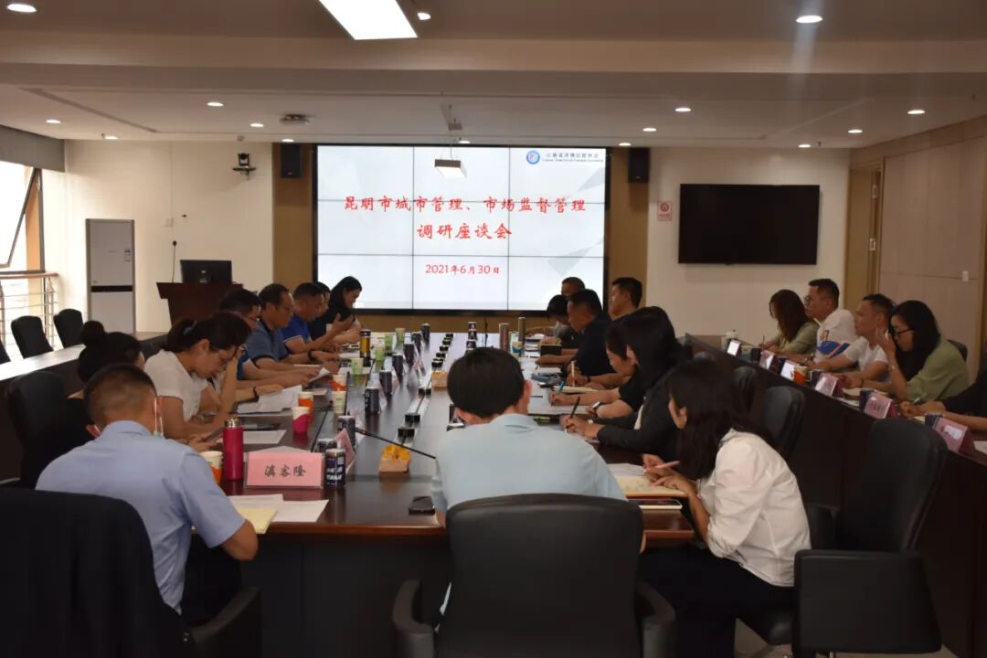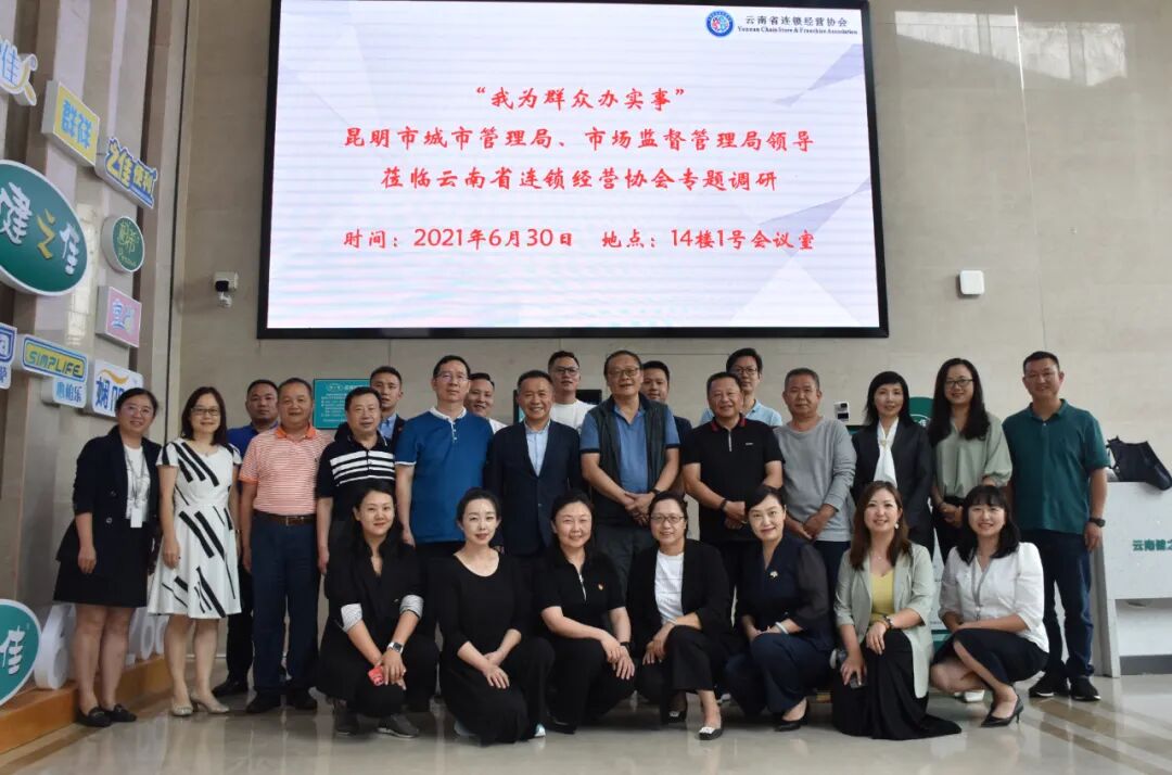 6月30日下午,为深入开展党史学习教育,扎实推进“我为群众办实事”实践活动,进一步深化“放管服”改革,不断优化营商环境,着力培育和激发市场主体活力,以崭新的面貌庆祝中国共产党成立100周年,迎接COP15胜利召开,昆明市城市管理局、市场监督管理局领导莅临云南省连锁经营协会,就昆明市城市管理、市场监督管理有关工作,召开了专题调研座谈会。昆明市城市管理局党组书记、局长陈剑平,市容秩序管理处处长金小海,广告处处长王先举,市政设施管理处副处长李亚嫔;昆明市市场监督管理局药品总监杨子江、药品化妆品监管处副处长(主持工作)刘萍、行政审批处正科级稽查员胡艳艳、登记注册处正科级稽查员李璐;云南省连锁经营协会会长蓝波、执行会长张云鸿、副秘书长邵文艳、综合管理部部长杨坤,以及云南健之佳健康连锁店股份有限公司、一心堂药业集团股份有限公司、云南之佳便利店有限公司、云南白药大药房有限公司、云南滇客隆商贸有限公司、昆明精益眼镜有限公司、国药控股云南有限公司、云南苏宁易购销售有限公司、沃尔玛(云南)商业零售有限公司、昆明家乐福超市有限公司、昆明肯德基有限公司、昆明日新达商贸服务有限公司、昆明早城商业管理有限公司、云南速鲜连锁超市有限公司等14家连锁企业有关负责人参加了本次专题调研座谈会。