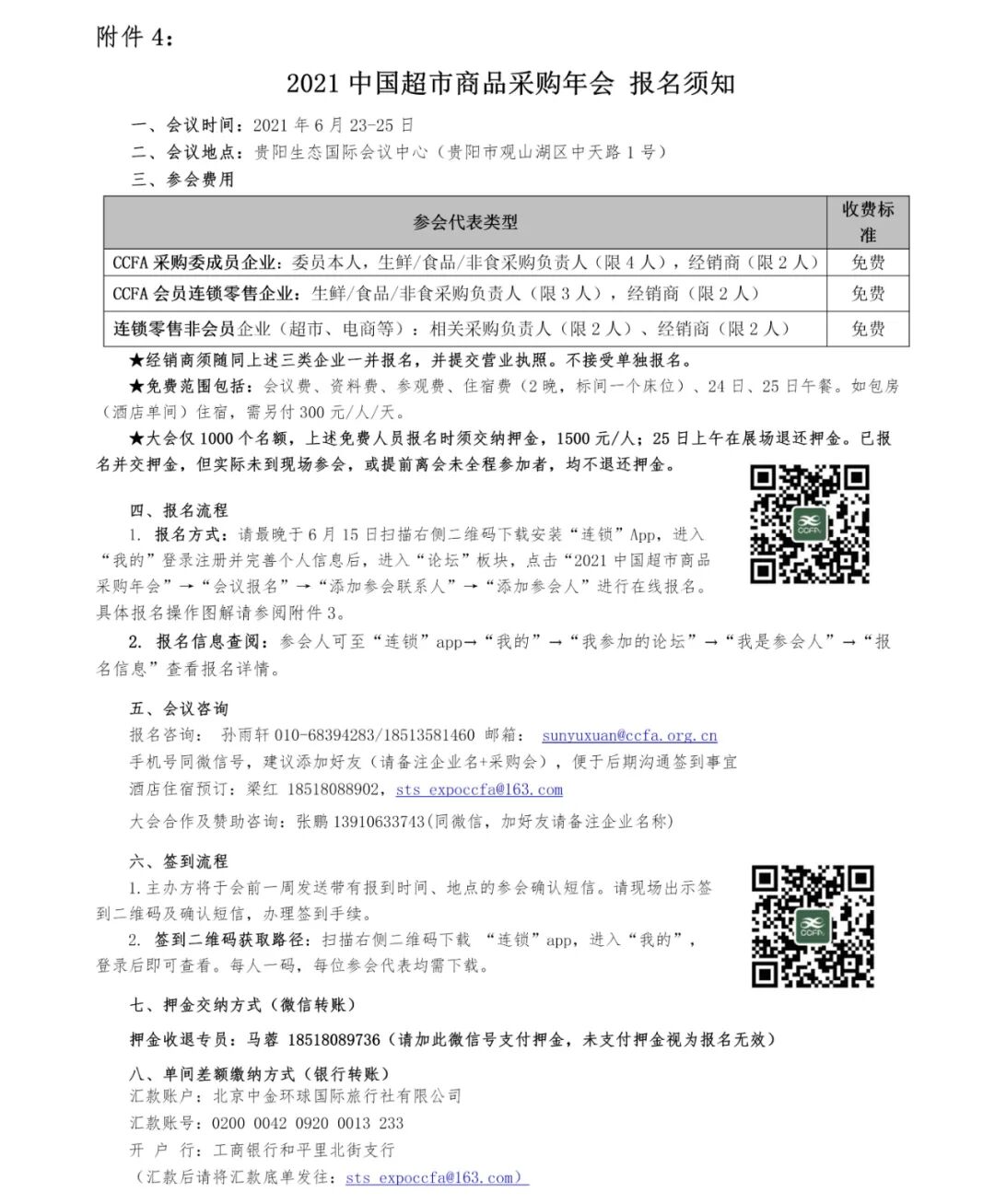 本次会议免费(报名时须交纳押金,1500元/人;25日上午在展场退还押金)。免费范围包括:会议费、资料费、参观费、住宿费(2晚,标间一个床位)以及24日、25日午餐。如包房(酒店单间)住宿,需另付300元/人/天。已报名并交押金,但实际未到现场参会,或提前离会未全程参加者,均不退还押金。经销商须随同零售企业一并报名,并提交营业执照,不接受单独报名。
