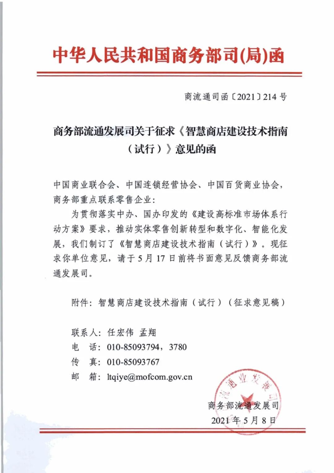 / 关于转发《商务部流通发展司关于征求<智慧商店建设技术指南(试行)>意见的函》的通知