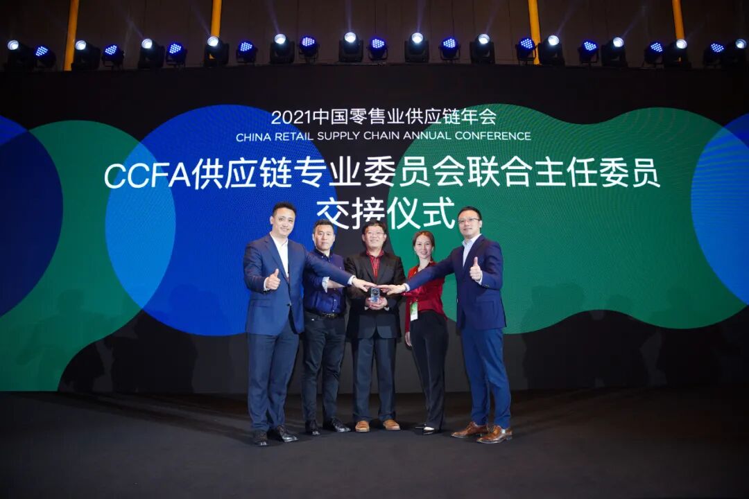 本次会上,还举行了CCFA供应链专业委员会联合主任委员的交接仪式。京东集团副总裁傅兵、内蒙古伊利实业集团副总裁郭云龙将CCFA供应链专委会主任委员印交接给新任联合主任委员华润万家有限公司总部物流部总监吴桉和宝洁(中国)营销有限公司全域零售事业群供应链总经理方齐。