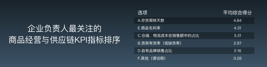 谈到企业负责人关注的商品经营与供应链KPI指标排序时,彭建真秘书长表示,存货周转天数排在第1位,第2位是商品毛利率,“这可能会和专业供应链岗位人员关注不太一样,企业负责人还是更关注生意上的问题,无论是存货周转天数还是商品毛利率或者是物流成本销售额中的占比都和生意相关。”