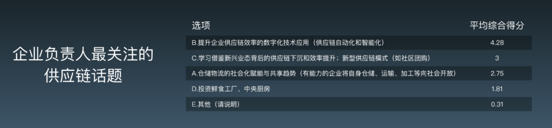 会上,彭建真秘书长分享了对协会理事会关于供应链话题的调研。调研结果显示,在企业负责人最关注的供应链话题里,排在第一位的是提升企业供应链效率的数字化应用,包括供应链自动化和智能化。第二位是学习借鉴新兴业态背后的供应链下沉和效率提升,包括社区团购的模式。另外,仓储物流的社会化赋能与共享趋势也是企业负责人比较关注的话题。