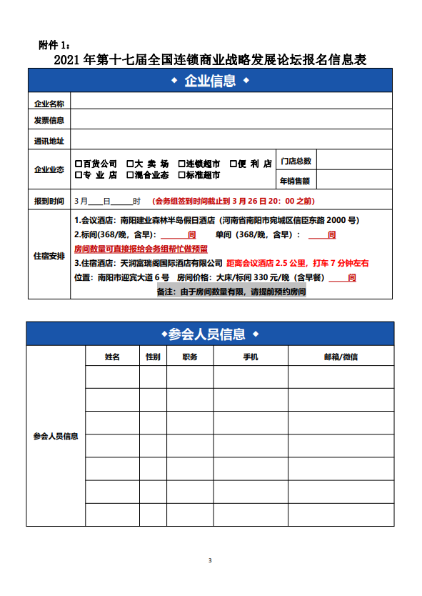 2021,零售业面临的挑战,比以往任何时候都要严峻!2021,将是洗心革面之年,我们需要重新梳理、定位自己。线上分流、消费分级、竞争加剧,接下来几年的零售企业会越来越难。区域中小零售企业该如何应对挑战?由龙商网&超市周刊主办,万德隆集团、想念食品股份有限公司协办的“第十七届全国连锁商业战略发展论坛”将于2021年3月27日-28日在河南南阳隆重召开,围绕传统零售企业经营发展的道与术,来自全国的行业大咖和线上线下创新头部企业将进行精彩分享。现将本次发展论坛具体事宜通知如下:三、参会对象:连锁超市、大卖场、社区超市、便利店、百货、购物中心、专业店等企业董事长、总经理、副总、总监、店长等四、会议形式:主题演讲+案例解析+对话论坛+门店参观+展览对接参会费用:会议费2880元/人(协会会员单位优惠价:1280元/人,非会员单位8折优惠:2304元/人);交通食宿费用自理(请自行预订)。参会费用缴纳:请汇款至指定账户,并注明“发展论坛”字样。请各会员单位、云南省各相关企业积极报名参会,参会企业请于2021年3月19日12:00前将报名信息表(附件1)及缴费凭证扫描件发送至协会秘书处,秘书处汇总后统一上报至会议主办方。附件1电子版内容,请关注协会微信公众号,通过首页对话框回复“发展论坛”获取。云南省连锁经营协会成立于2019年9月,是由云南省从事连锁经营服务的企业和相关专家、管理人员自愿组成的地方性、行业性、非营利性社会团体,登记机关为省民政厅,业务指导单位为省商务厅。协会现有会员单位近90家,覆盖药店、便利店、百货超市、书店、电器专营店、餐饮、眼镜、高校、数码产品专营等10余个业态,连锁店铺总计超过1.5万个。2019年,销售额近400亿元,约占全省社会消费品零售总额的5.3%。2020年,13家会员单位入选“2020云南省非公企业100强”榜单,2家会员单位入选2020年云南省“10大名药材”榜单,1家会员单位入选2020年云南省“10大名菜”榜单,3家会员单位入选2020年云南省绿色食品“10强企业”榜单,2家会员单位入选2020年云南省绿色食品“20佳创新企业”榜单。 文章来源:黑龙江省连锁经营协会
