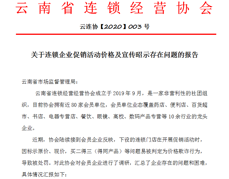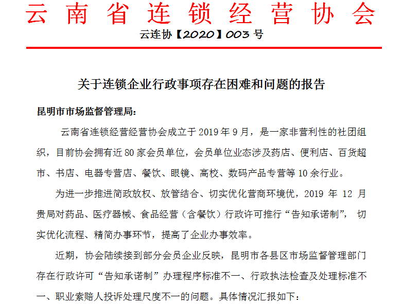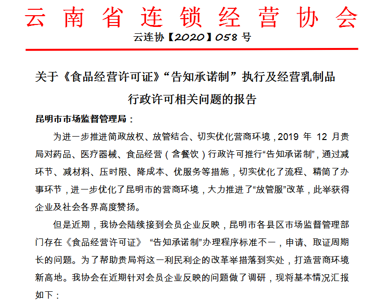 ▲11月3日,协会就会员企业反映的昆明市各县区市场监督管理部门存在《食品经营许可证》 “告知承诺制”办理程序标准不一,申请、取证周期长的问题,形成专题报告,反映至昆明市市场监督管理局。![]()