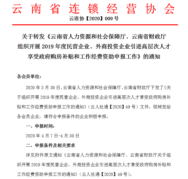 ▲4月10日,协会转发《云南省人力资源和社会保障厅、云南省财政厅组织开展2019年度民营企业、外商投资企业引进高层次人才享受政府购房补贴和工作经费资助申报工作的通知》,积极组织符合条件的企业参与申报。![]()