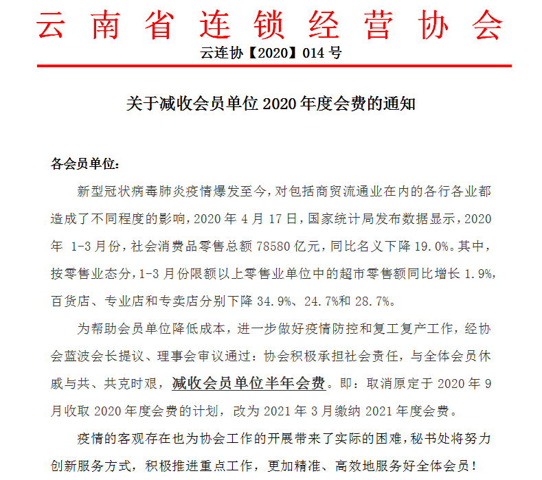 2021年,协会将在2020年工作基础上,再接再厉、积极进取,充分为政府收集相关信息数据,为企业和政府搭建沟通交流的平台,为会员搭建业内交流合作的平台,提供系统化专业培训和行业发展信息数据,维护会员合法权益,反映行业诉求,营造协同协作、有序竞争、共赢发展的良好环境,推进云南连锁经营事业的健康发展。同时,实施规范管理,接受社会监督,履行社会责任,努力为云南经济转型、消费升级作出贡献,为谱写好中国梦云南篇章而努力,为提升云南人民的幸福感而努力。![]()