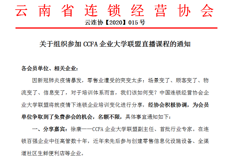 ▲4月27日,协会下发《关于组织参加CCFA企业大学联盟直播课程的通知》,积极组织会员单位及企业参加中国连锁经营协会企业大学联盟举办的“突变与突破——疫情之后,连锁业培训变化的思考”直播课程。![]()