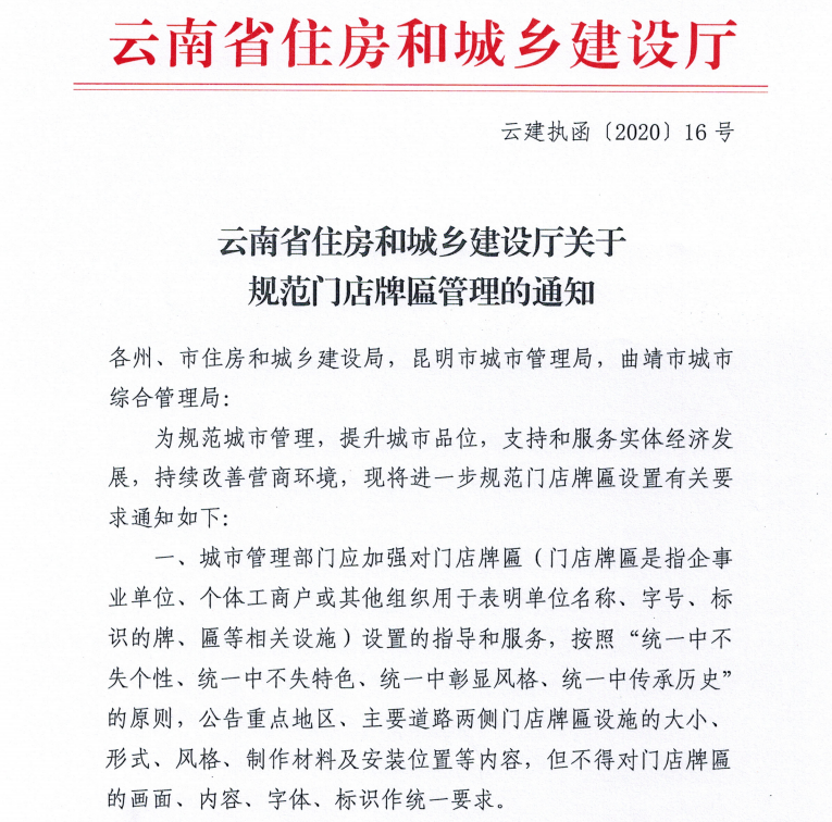 ▲5月27日,经协会专题汇报、积极协调,省住建厅下发了《云南省住房和城乡建设厅关于规范门店牌匾管理的通知》,通知明确要求:(1)不得对门店牌匾的画面、内容、字体、标识做统一要求;(2)取消门店牌匾事前审批,加强事中事后监管,不得设置有效期。有效解决了长期困扰连锁企业户外广告门头不统一和《户外广告设施设置许可证》办理标准不统一等问题和困难。![]()