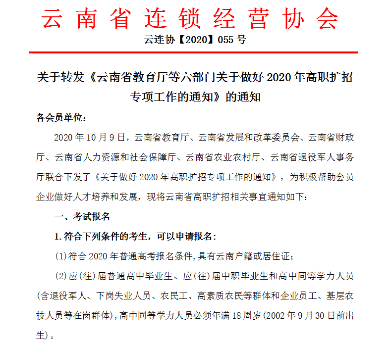 ▲10月16日,协会转发《云南省教育厅等六部门关于做好2020年高职扩招专项工作的通知》,积极动员企业员工报考高职院校、提升学历水平,帮助会员企业做好人才培养和发展。![]()