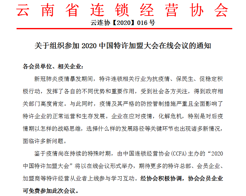 ▲4月27日,协会下发《关于组织参加2020中国特许加盟大会在线会议的通知》,积极组织会员单位及企业参加中国连锁经营协会主办的以“数字化特许VS疫情”为主题的“2020中国特许加盟大会”在线会议。![]()