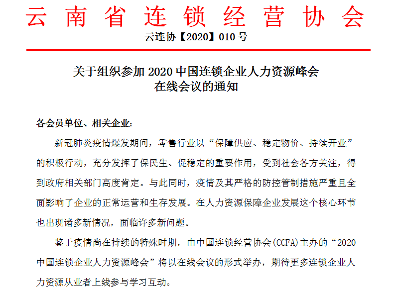 ▲4月13日,协会下发《关于组织参加2020中国连锁企业人力资源峰会在线会议的通知》,积极组织会员单位及企业参加中国连锁经营协会主办的“2020中国连锁企业人力资源峰会”在线会议。![]()