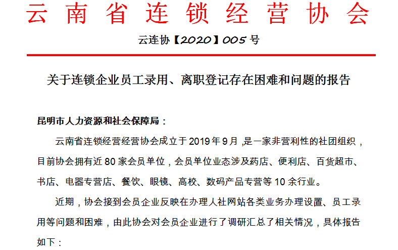 ▲5月7日,协会就会员企业反映的各类人社业务办理设置、员工录用等问题和困难,形成专题报告,反映至昆明市人力资源与社会保障局。![]()