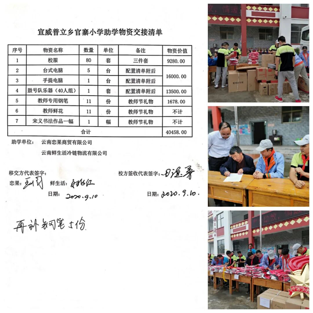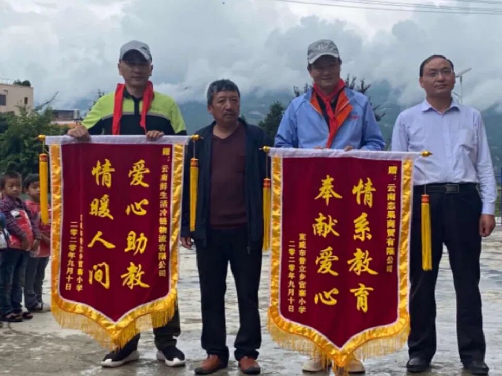 9月10日,云南省连锁经营协会会员单位云南恋果商贸有限公司总经理王义国、云南鲜生活冷链物流有限公司副总经理高峰(代表公司总经理姚红参加)及相关工作人员一行25人,凌晨6点从昆明出发,驱车近400公里来到宣威市普立乡官寨小学,为孩子们送上了学校所需求的价值总计4万余元的爱心助学物资,包括:三件套校服80套、台式电脑5台、手提电脑1台、40人组鼓号队乐器1套。特别选择在教师节当天专程而来的两家会员单位一行,还邀请了云南师范大学文理学院的宋义老师(主要授课课程为书法、美术史、篆刻等),作为教师代表一同前往,并书写了《薪火相传》书法作品赠送学校;与此同时,两家会员单位还为学校的老师们献上了精心订制的钢笔和鲜花,给老师们送上了节日的祝福。云南省连锁经营协会及党支部自成立以来,主动作为,勇于担当,大力弘扬慈善精神,积极投身公益事业,在助力打赢疫情防控阻击战、决战决胜脱贫攻坚战等方面,作出了应有的贡献。协会党支部还向会员单位发出号召:注重企业发展的同时,用实际行动积极承担企业的社会责任,服务回馈社会,在教育、扶贫等社会公益活动中真情投入。作为协会党支部工作的内容之一,本次爱心助学活动,受到了宣威市普立乡官寨小学师生们的充分肯定和高度赞扬。学校领导对协会及党支部的关心、关爱表达了谢意,并为两家会员单位献上了主题分别为“情系教育,奉献爱心”“爱心助教,情暖人间”的锦旗。 文章来源:黑龙江省连锁经营协会