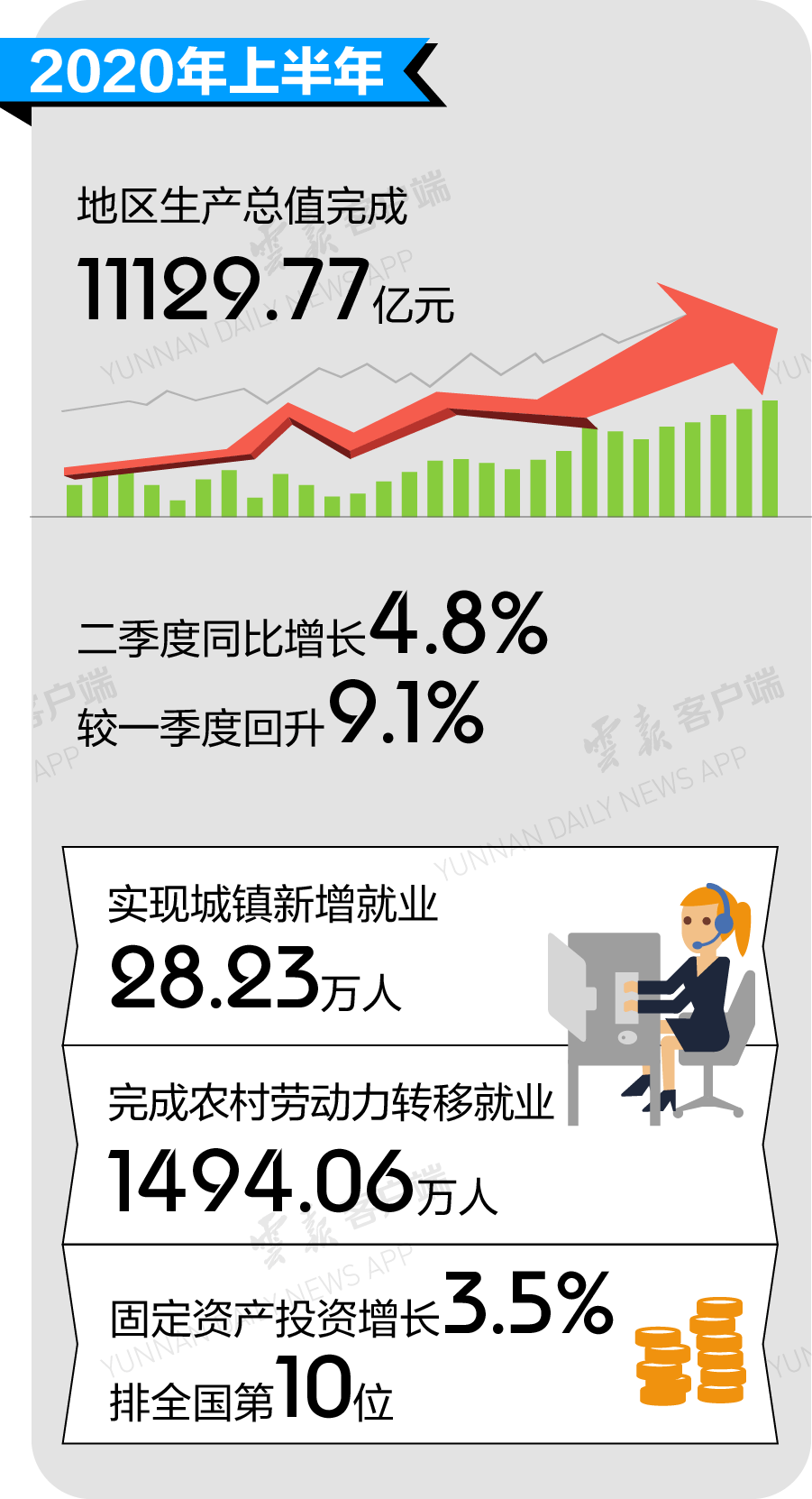 疫情大考,百业艰难。今年一季度,云南GDP增速-4.3%,随后便拉出一条上扬的曲线——二季度同比增长4.8%,较一季度回升9.1%