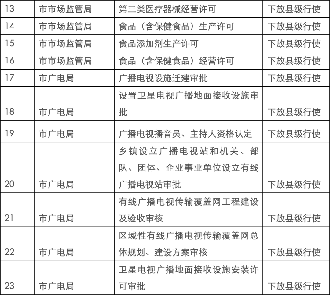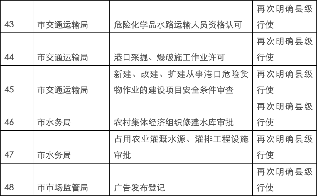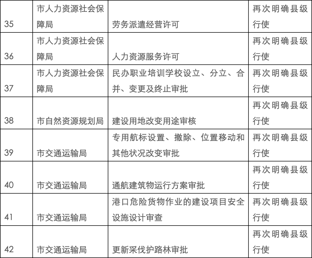 调整41项行政许可事项,其中乡村建设规划许可证核发、动物诊疗许可证核发、药品零售企业许可等27项调整为县级行使;劳务派遣经营许可、民办职业培训学校设立、分立、合并、变更及终止审批、广告发布登记等14项调整为再次明确县级行使。
