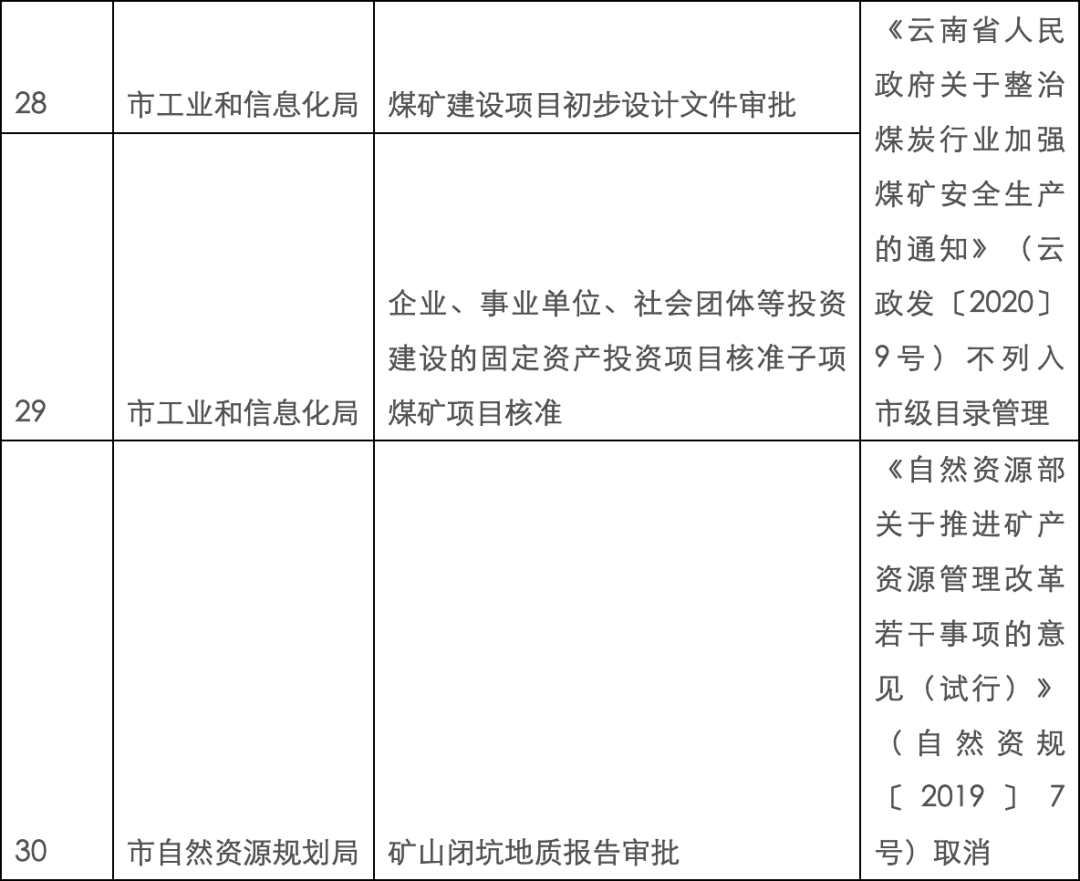 4月29日,昆明市人民政府官网发布《关于调整部分行政许可事项的通知》(下称《通知》),取消7项行政许可事项,矿山闭坑地质报告审批、