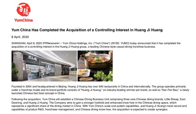 4月8日,中国最大的餐饮运营公司百胜中国(NYSE:YUMC)在一份公告中宣布,正式完成对黄记煌的控股权收购。该公告显示,收购完成后,百胜中国将成立中餐事业部,该事业部由三个核心中式餐饮品牌组成:小肥羊、东方既白和黄记煌。这是继东方既白和小肥羊之后,这家肯德基和必胜客的母公司第三次加码中餐市场。百胜中国在公告表示,随着黄记煌的加入,该公司希望在中式餐饮领域拥有更强的立足之地,并增强在该领域的专业知识,因为中式餐饮在中国的餐饮市场上“拥有相当大的份额”。2、沃尔玛宣布未来5年在武汉投资30亿元 计划新开设4家山姆会员商店