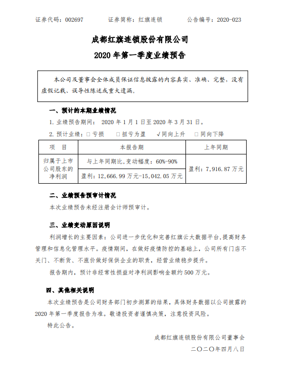 记者从丁兰街道获悉,山姆会员店杭州城北店落户在西子智慧产业园,最快将于今年11月建成投用。据悉,这是杭州第二家山姆会员店,第一家店位于杭州西溪印象城。山姆会员店杭州城北店总面积约1.45万平米,层高9米,配有1200个以上停车位,将辐射半径10公里以上的商圈。该店距离地铁3号线(在建)同协路站出口约300米,距离火车东站约6公里,周边还有15条公交线路辅助出行。近日,卫龙辣条和安踏官宣,他们要合体搞事了!此次,两大品牌联名合作推出联名礼包,除了T恤鞋带和卫龙小食品,还有联名手袋以及全新“千禧鞋”。2020,作为从千禧开始走向世界的流量担当卫龙和安踏,妥妥占据了80、90后青春年少回忆。辣条和运动鞋,食品和鞋服,两大“回忆杀”合体,是不是很奇妙呢?玩“联名”,果然还是辣条界扛把子卫龙和鞋界大佬安踏会玩。5、新城控股一季度合同销售额309.8亿 同比下滑33.68%4月8日晚间,新城控股披露2020年3月份及第一季度经营简报。根据公告,3月份,新城控股实现合同销售金额约142.58亿元,同比下降38.16%;销售面积约136.68万平方米,同比下降30.48%。1-3月,新城控股累计合同销售金额约309.81亿元,比上年同期下降33.68%,累计销售面积约285.82万平方米,比上年同期下降31.17%。此外,新城控股宣布新增6个土地项目,其中于江苏共获得3个项目,江西、河南、云南分别获得1个项目。4月8日消息,此前,家乐福会员体系全新升级,正式上线“随时会员”,全面满足“一小时场景生活圈”内消费者一日三餐和日常居家生活需求。而为明天即将到来的“随时会员日”,家乐福加码“随时会员”的专属权益,推出全场八折会员优惠(生鲜、海报、特殊商品除外),覆盖衣物清洁、日用洗护、休闲食品、百货纺织等多个品类,帮助满足消费者多元化、差异化的消费需求。4月8日消息,钛媒体获悉便利蜂已进入山东便利店市场。首批开业的两家门店位于济南市天桥区。据了解,便利蜂在山东还有近十家门店正在紧张筹备中,将于近期在济南、青岛相继开业。(钛媒体)8、红旗连锁预计一季度净利润同比增长60%-90%4月8日下午,红旗连锁发布2020年第一季度业绩预告:预计归属上市公司股东的净利润为1.27亿元-1.5亿元,同比增长60%-90%。据金融分析公司S3 Partner数据,瑞幸咖啡是上周美国股市空头最赚钱的股票,上周五日瑞幸咖啡平均空头仓位市值为5.59亿元,净盈利为7.05亿元,空头净盈利率高达126%。瑞幸咖啡上周四(4月2日)自爆财务造假,单周股价跌79%。空头净盈利率第二和第三分别是嘉年华油轮(CARNIVAL)和美国航空(AIMERICAN AIRLINES),分别为47.1%和41.7%。(财联社)10、乔丹体育侵权案终审败诉:“乔丹+图形”商标被撤