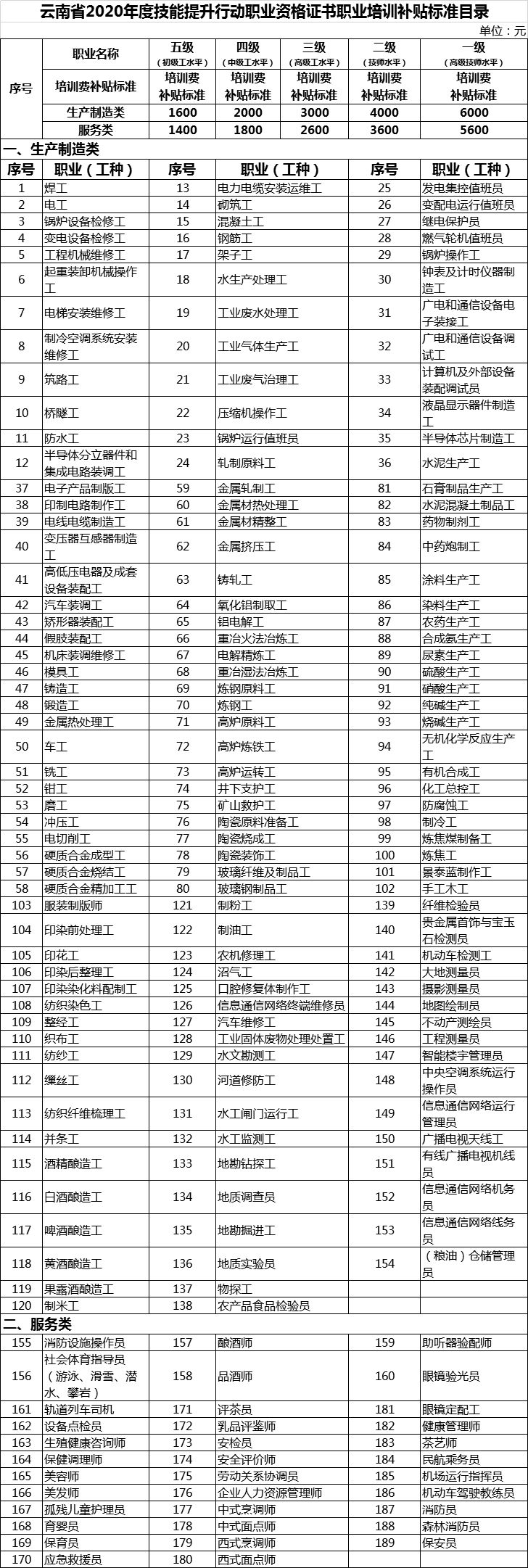 云南省2020年度技能提升行动培训合格证书职业培训补贴标准: