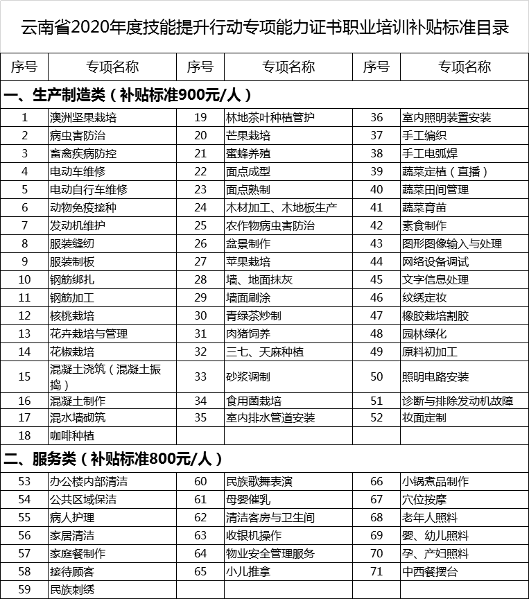 为着力提升职业技能培训的针对性和有效性,促进更高质量更充分就业,提高补贴资金的使用效率,近日,云南省人力资源和社会保障厅、云南省财政厅联合制定了《云南省2020年度职业技能培训创业培训补贴标准目录》(以下简称《目录》),各地使用就业补助资金和技能提升行动专账资金的各类培训补贴按《目录》执行。