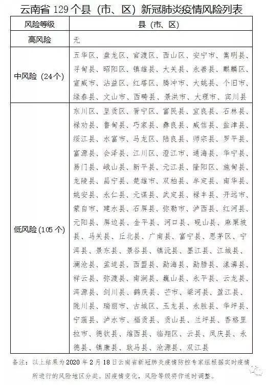 备注:以上结果为2020年2月18日云南省新冠肺炎疫情防控专家组根据实时疫情所进行的风险地区分类。因疫情变化,风险等级将作适时调整。