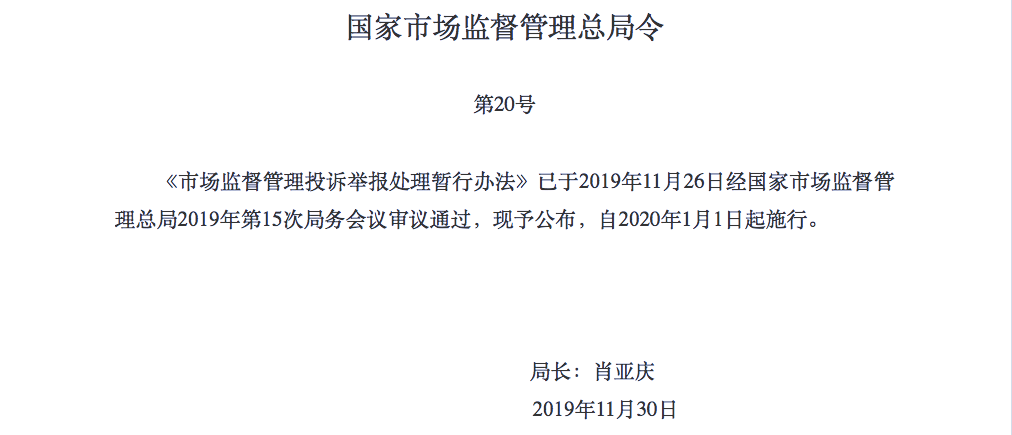 (2019年11月30日国家市场监督管理总局令第20号公布)第一条 为规范市场监督管理投诉举报处理工作,保护自然人、法人或者其他组织合法权益,根据《中华人民共和国消费者权益保护法》等法律、行政法规,制定本办法。第二条 市场监督管理部门处理投诉举报,适用本办法。第三条 本办法所称的投诉,是指消费者为生活消费需要购买、使用商品或者接受服务,与经营者发生消费者权益争议,请求市场监督管理部门解决该争议的行为。本办法所称的举报,是指自然人、法人或者其他组织向市场监督管理部门反映经营者涉嫌违反市场监督管理法律、法规、规章线索的行为。第四条 国家市场监督管理总局主管全国投诉举报处理工作,指导地方市场监督管理部门投诉举报处理工作。县级以上地方市场监督管理部门负责本行政区域内的投诉举报处理工作。第五条 市场监督管理部门处理投诉举报,应当遵循公正、高效的原则,做到适用依据正确、程序合法。第六条 鼓励社会公众和新闻媒体对涉嫌违反市场监督管理法律、法规、规章的行为依法进行社会监督和舆论监督。鼓励消费者通过在线消费纠纷解决机制、消费维权服务站、消费维权绿色通道、第三方争议解决机制等方式与经营者协商解决消费者权益争议。第七条 向市场监督管理部门同时提出投诉和举报,或者提供的材料同时包含投诉和举报内容的,市场监督管理部门应当按照本办法规定的程序对投诉和举报予以分别处理。第八条 向市场监督管理部门提出投诉举报的,应当通过市场监督管理部门公布的接收投诉举报的互联网、电话、传真、邮寄地址、窗口等渠道进行。投诉人采取非书面方式进行投诉的,市场监督管理部门工作人员应当记录前款规定信息。第十条 委托他人代为投诉的,除提供本办法第九条第一款规定的材料外,还应当提供授权委托书原件以及受托人身份证明。授权委托书应当载明委托事项、权限和期限,由委托人签名。第十一条 投诉人为两人以上,基于同一消费者权益争议投诉同一经营者的,经投诉人同意,市场监督管理部门可以按共同投诉处理。共同投诉可以由投诉人书面推选两名代表人进行投诉。代表人的投诉行为对其代表的投诉人发生效力,但代表人变更、放弃投诉请求或者达成调解协议的,应当经被代表的投诉人同意。第十二条 投诉由被投诉人实际经营地或者住所地县级市场监督管理部门处理。对电子商务平台经营者以及通过自建网站、其他网络服务销售商品或者提供服务的电子商务经营者的投诉,由其住所地县级市场监督管理部门处理。对平台内经营者的投诉,由其实际经营地或者平台经营者住所地县级市场监督管理部门处理。上级市场监督管理部门认为有必要的,可以处理下级市场监督管理部门收到的投诉。下级市场监督管理部门认为需要由上级市场监督管理部门处理本行政机关收到的投诉的,可以报请上级市场监督管理部门决定。第十三条 对同一消费者权益争议的投诉,两个以上市场监督管理部门均有处理权限的,由先收到投诉的市场监督管理部门处理。第十四条 具有本办法规定的处理权限的市场监督管理部门,应当自收到投诉之日起七个工作日内作出受理或者不予受理的决定,并告知投诉人。第十五条 投诉有下列情形之一的,市场监督管理部门不予受理:(一)投诉事项不属于市场监督管理部门职责,或者本行政机关不具有处理权限的;(二)法院、仲裁机构、市场监督管理部门或者其他行政机关、消费者协会或者依法成立的其他调解组织已经受理或者处理过同一消费者权益争议的;(三)不是为生活消费需要购买、使用商品或者接受服务,或者不能证明与被投诉人之间存在消费者权益争议的;(四)除法律另有规定外,投诉人知道或者应当知道自己的权益受到被投诉人侵害之日起超过三年的;(五)未提供本法第九条第一款和第十条规定的材料的;第十六条 市场监督管理部门经投诉人和被投诉人同意,采用调解的方式处理投诉,但法律、法规另有规定的,依照其规定。第十七条 市场监督管理部门可以委托消费者协会或者依法成立的其他调解组织等单位代为调解。受委托单位在委托范围内以委托的市场监督管理部门名义进行调解,不得再委托其他组织或者个人。第十八条 调解可以采取现场调解方式,也可以采取互联网、电话、音频、视频等非现场调解方式。采取现场调解方式的,市场监督管理部门或者其委托单位应当提前告知投诉人和被投诉人调解的时间、地点、调解人员等。第十九条 调解由市场监督管理部门或者其委托单位工作人员主持,并可以根据需要邀请有关人员协助。调解人员是投诉人或者被投诉人的近亲属或者有其他利害关系,可能影响公正处理投诉的,应当回避。投诉人或者被投诉人对调解人员提出回避申请的,市场监督管理部门应当中止调解,并作出是否回避的决定。第二十条 需要进行检定、检验、检测、鉴定的,由投诉人和被投诉人协商一致,共同委托具备相应条件的技术机构承担。除法律、法规另有规定的外,检定、检验、检测、鉴定所需费用由投诉人和被投诉人协商一致承担。检定、检验、检测、鉴定所需时间不计算在调解期限内。(二)投诉人与被投诉人对委托承担检定、检验、检测、鉴定工作的技术机构或者费用承担无法协商一致的;(三)投